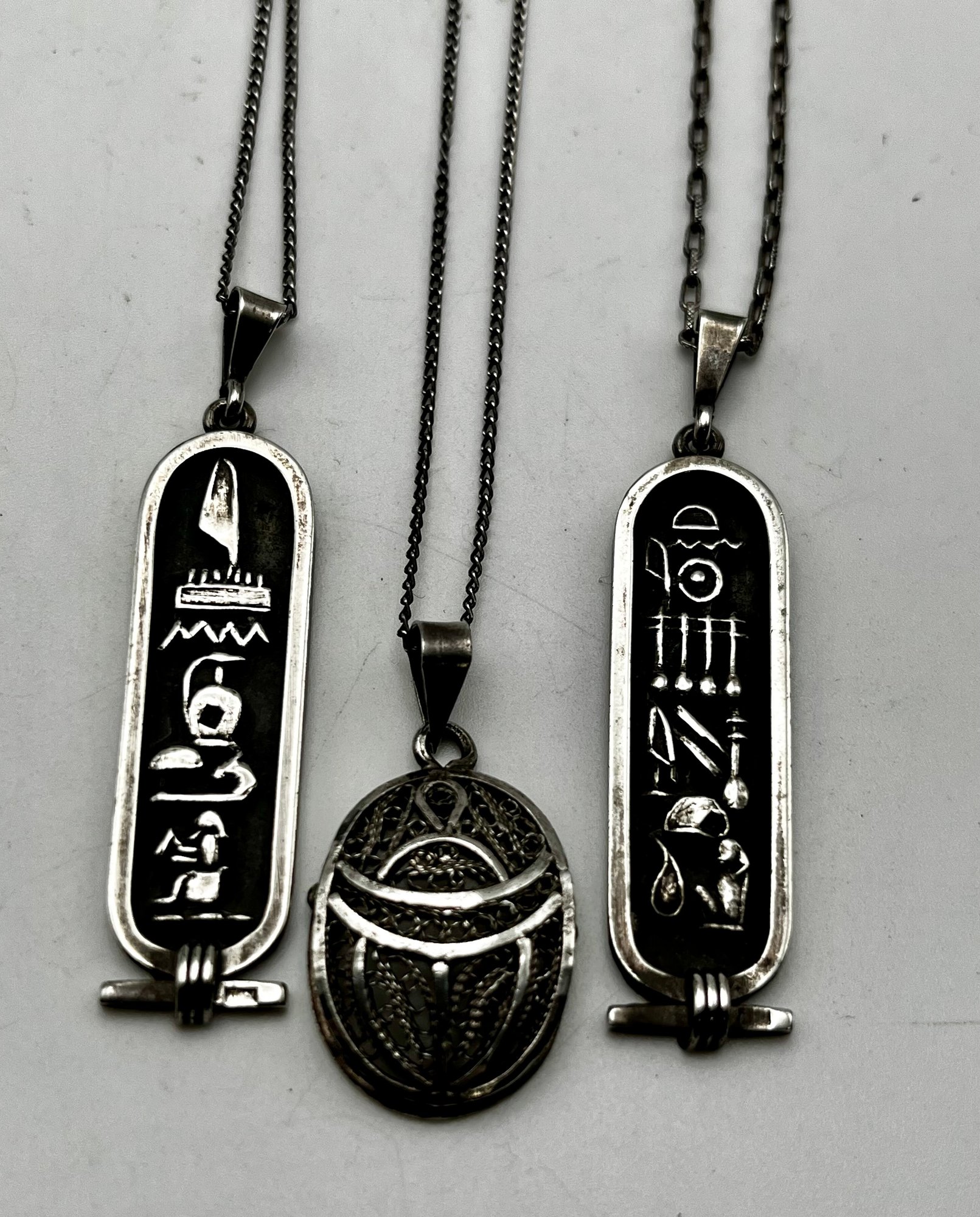 Vintage Sterling Egyptian Hieroglyphics Three necklaces. No markings found on the scarab there are marks on both Egyptian pieces but I cannot read them one of the chains is marked sterling the other two have had clasp changed and are not sterling