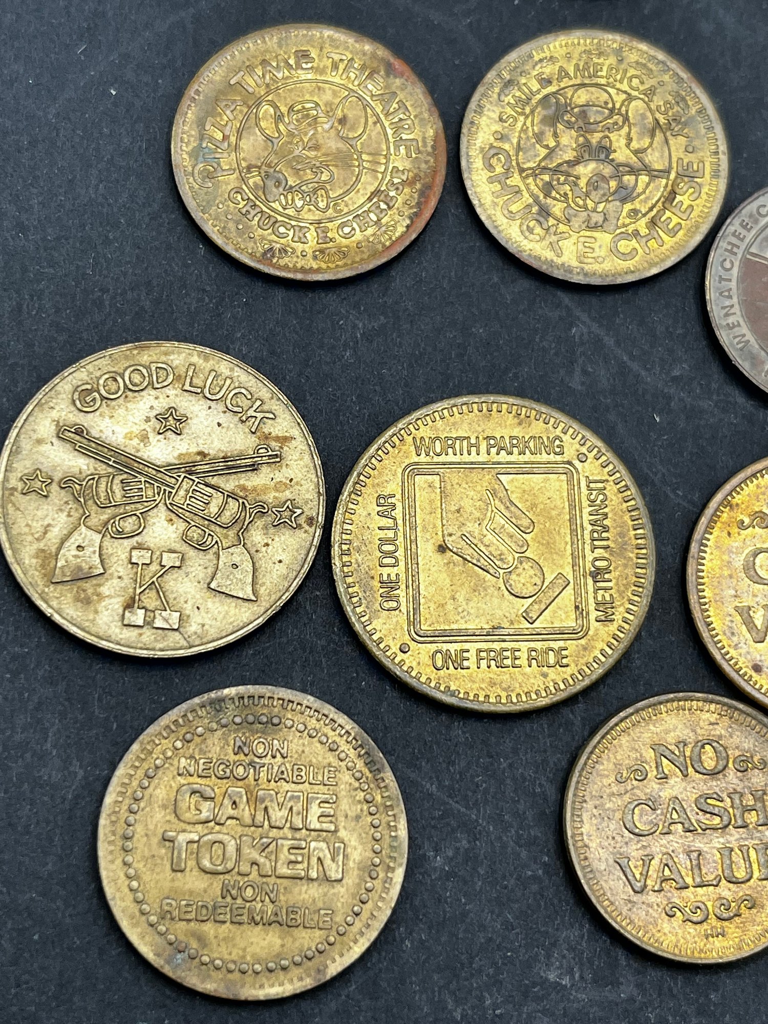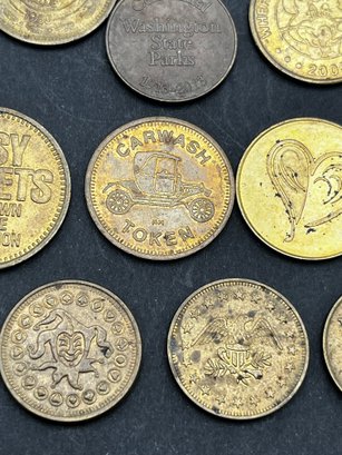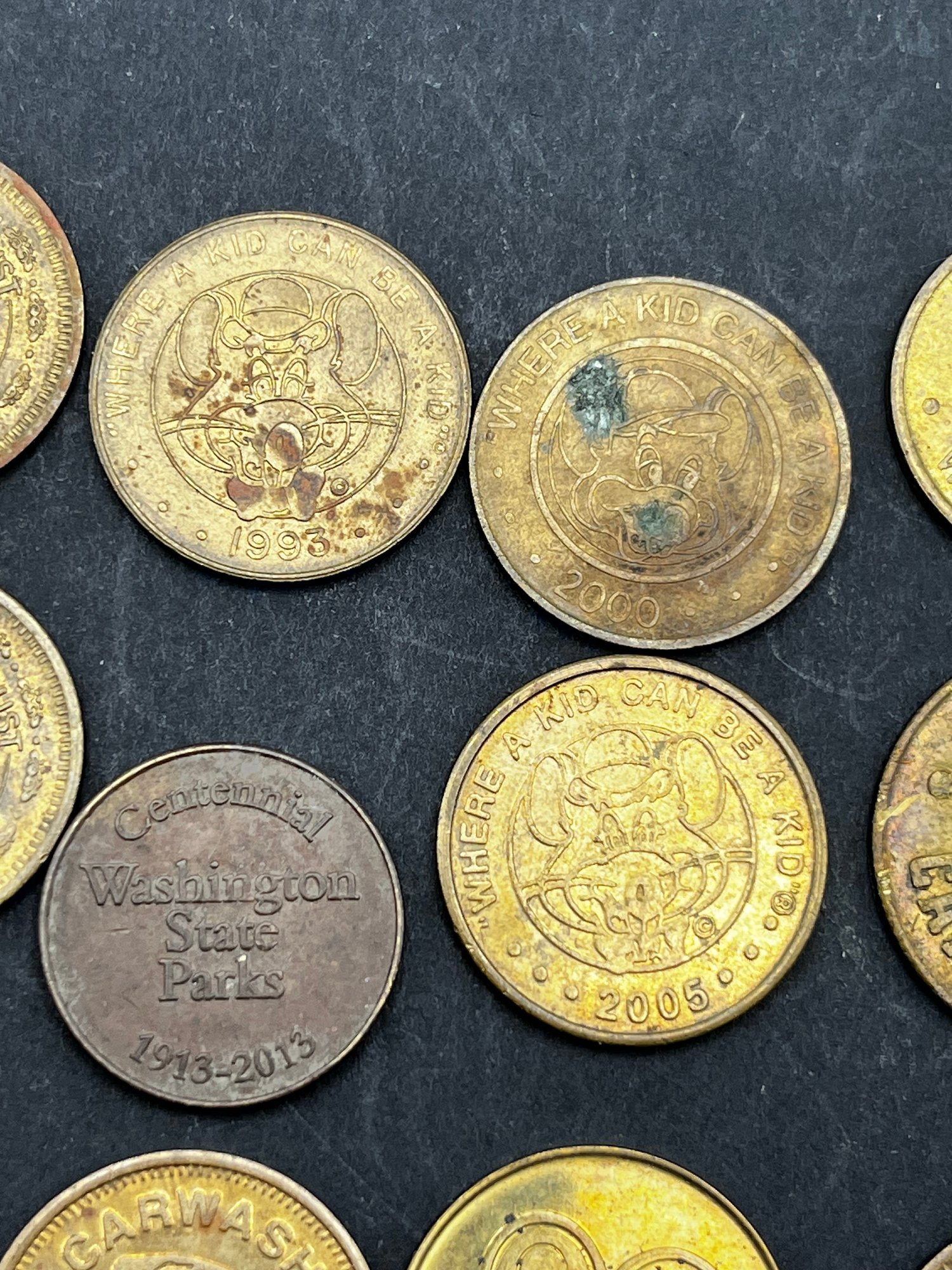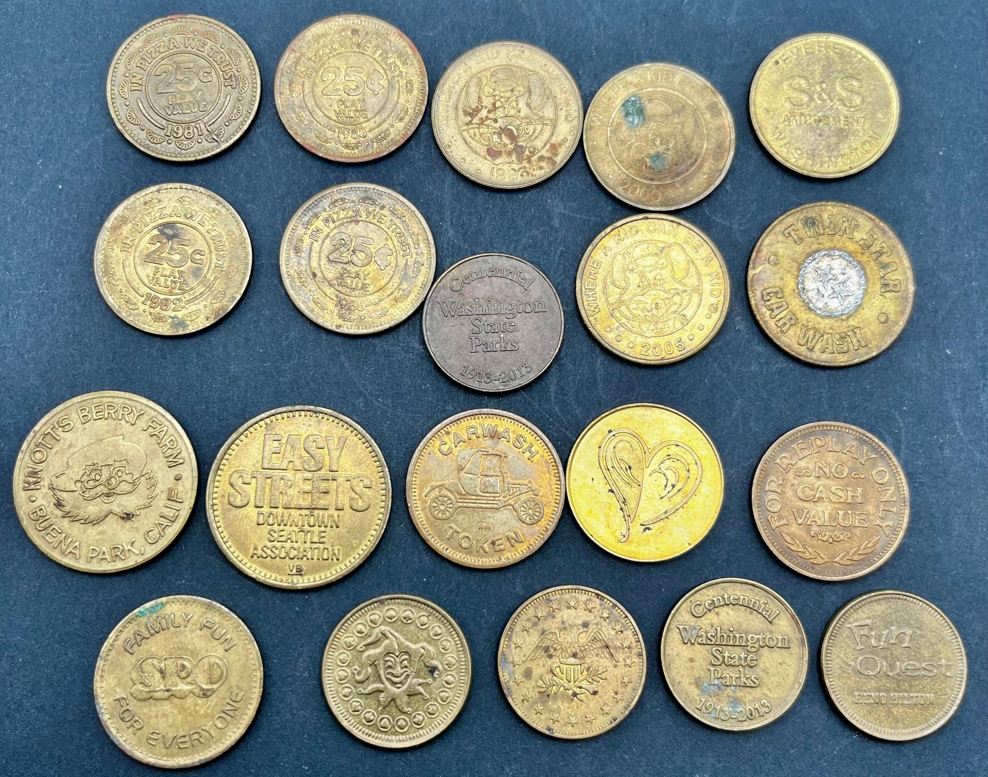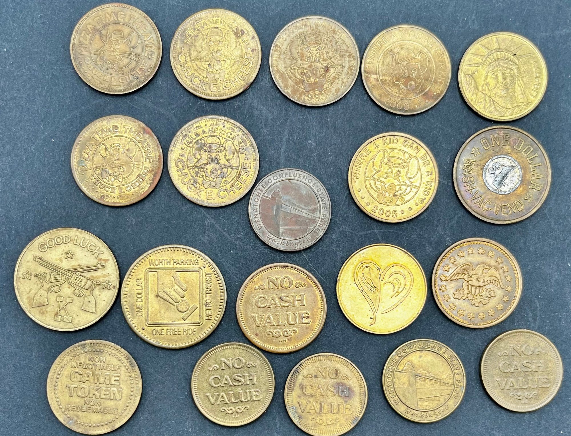 Vintage Tokens Lot of 20. Chuck E Cheese 1981, 82, 83, 93, 2000, Washington state parks , easy streets Seattle, S&S Everett Wa, knotts berry farm