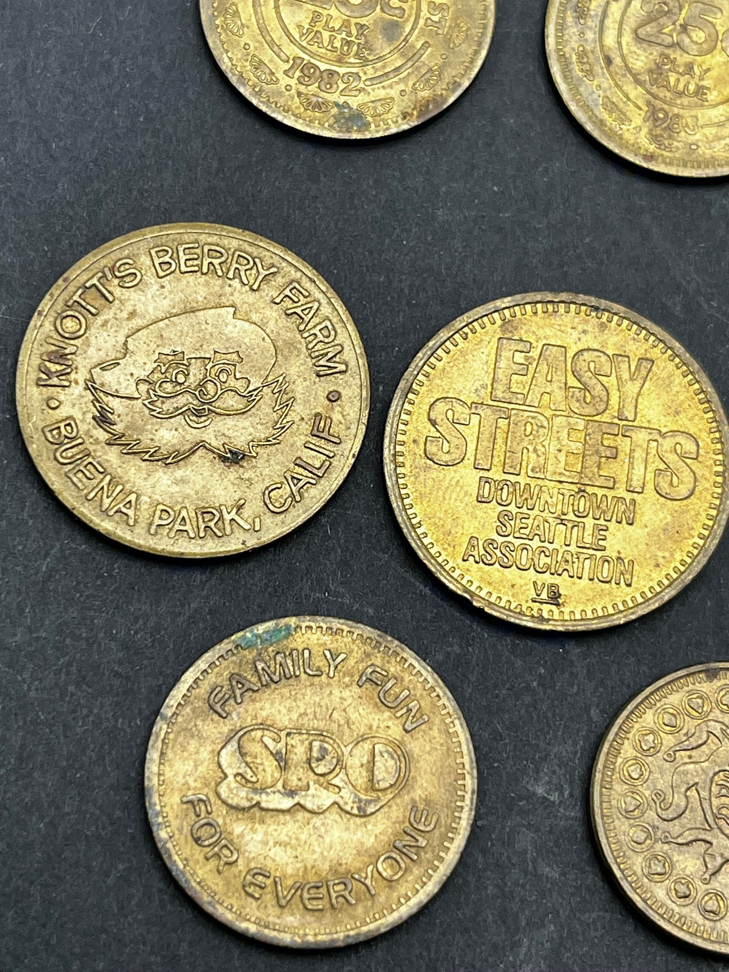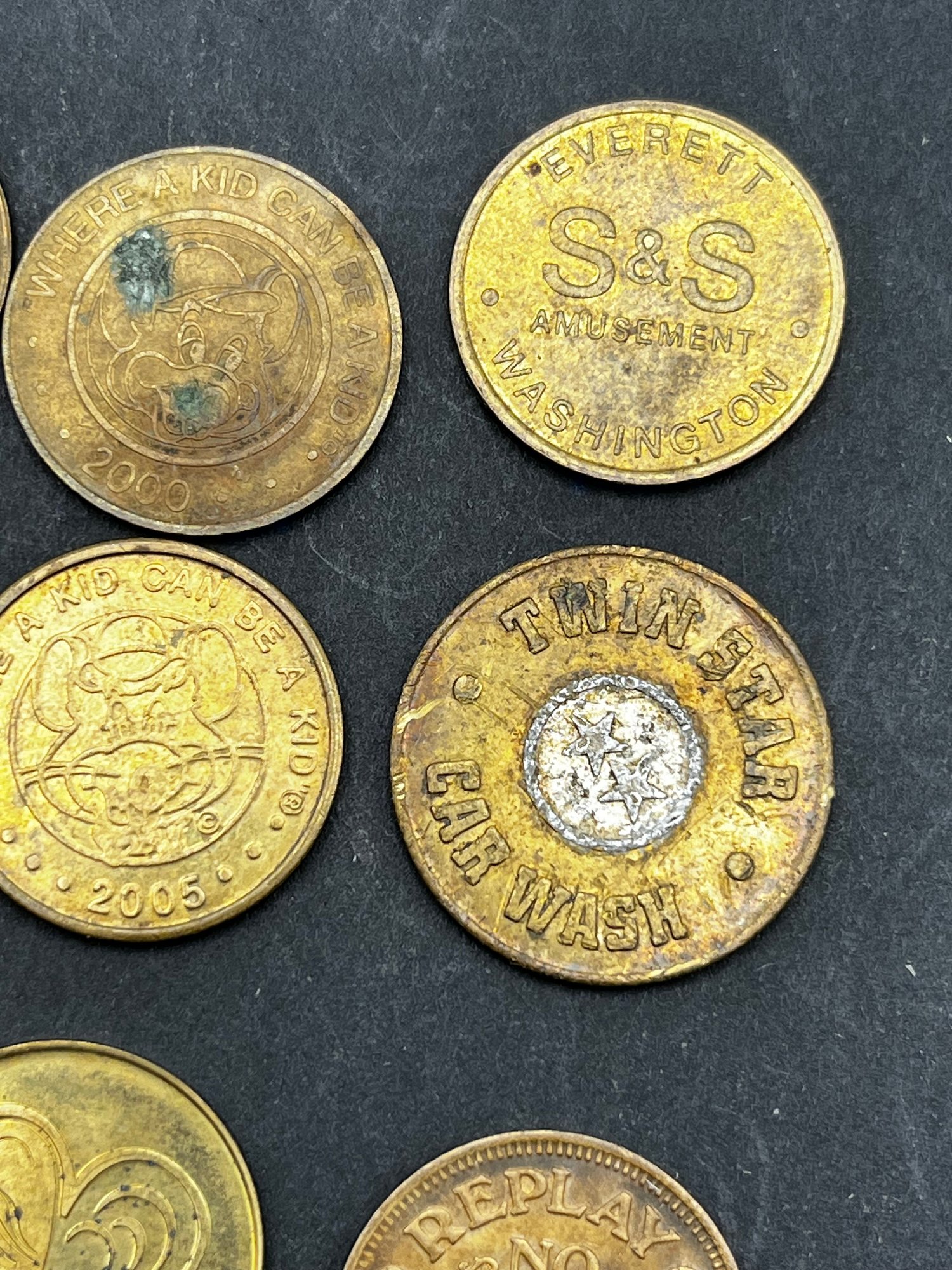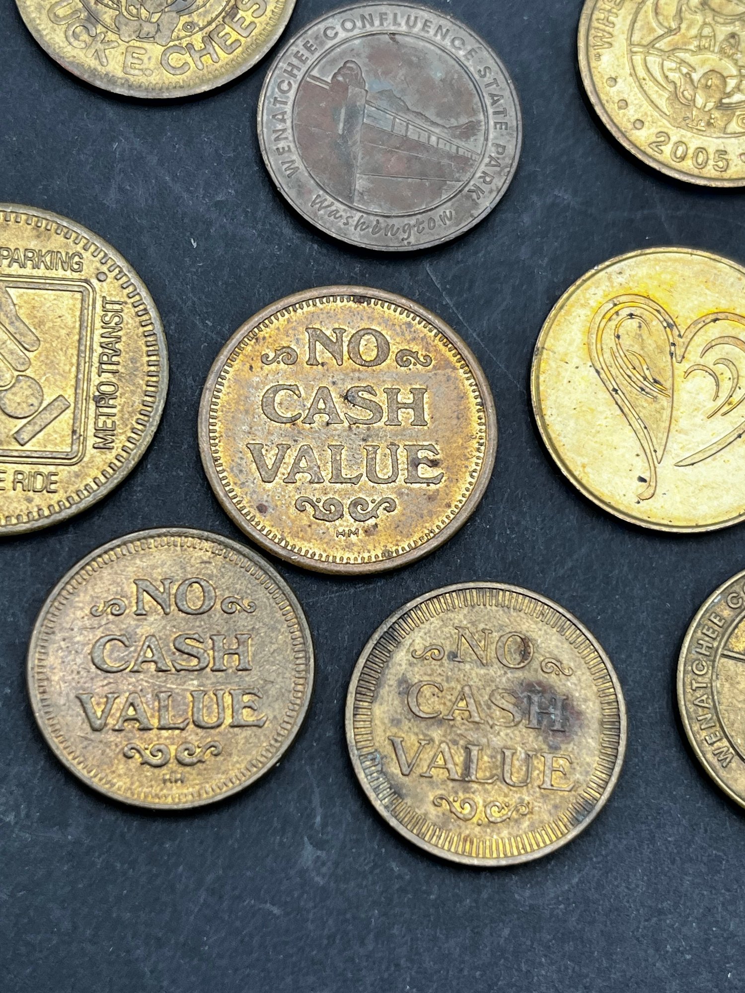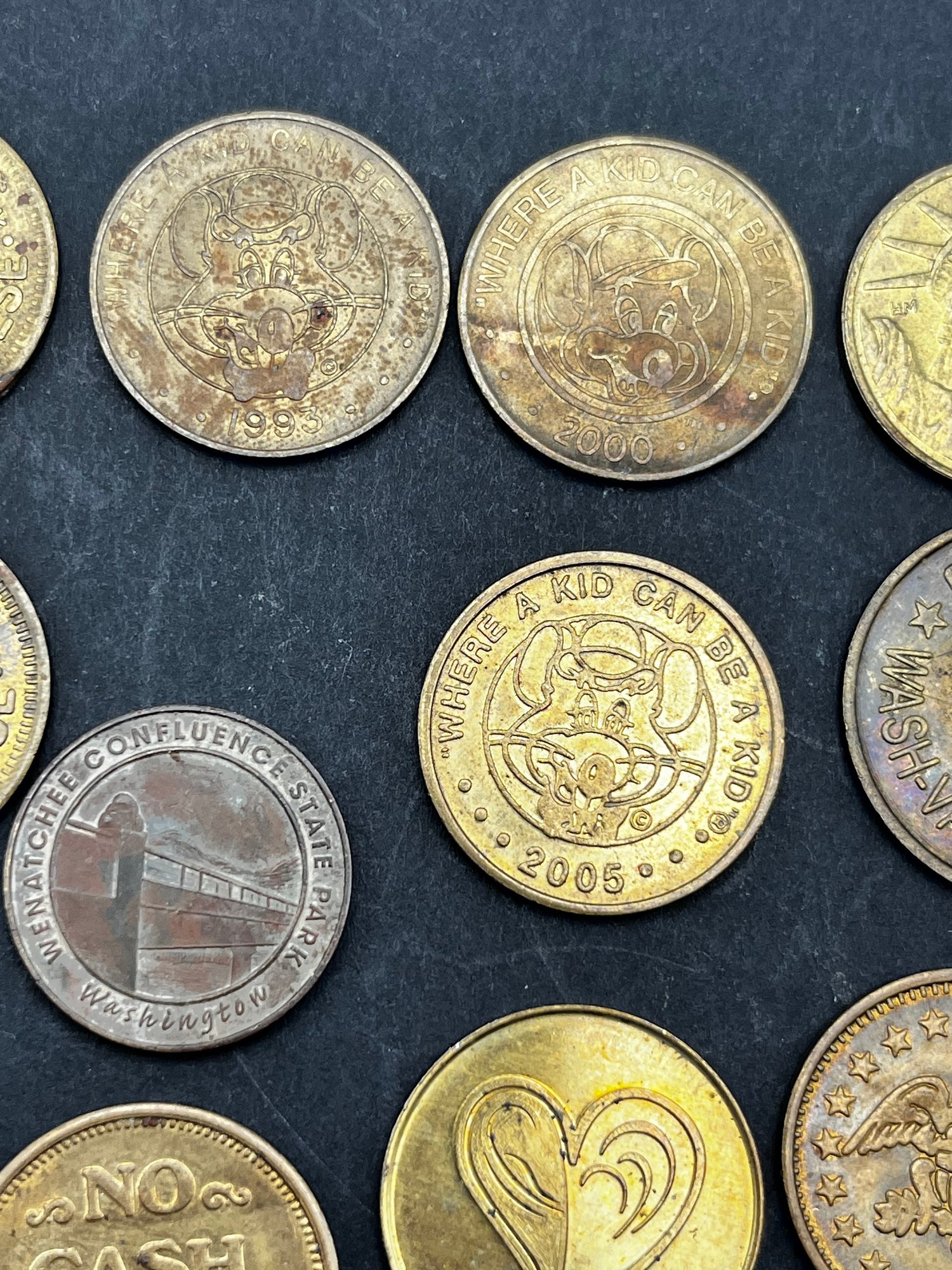 Vintage Tokens Lot of 20. Chuck E Cheese 1981, 82, 83, 93, 2000, Washington state parks , easy streets Seattle, S&S Everett Wa, knotts berry farm