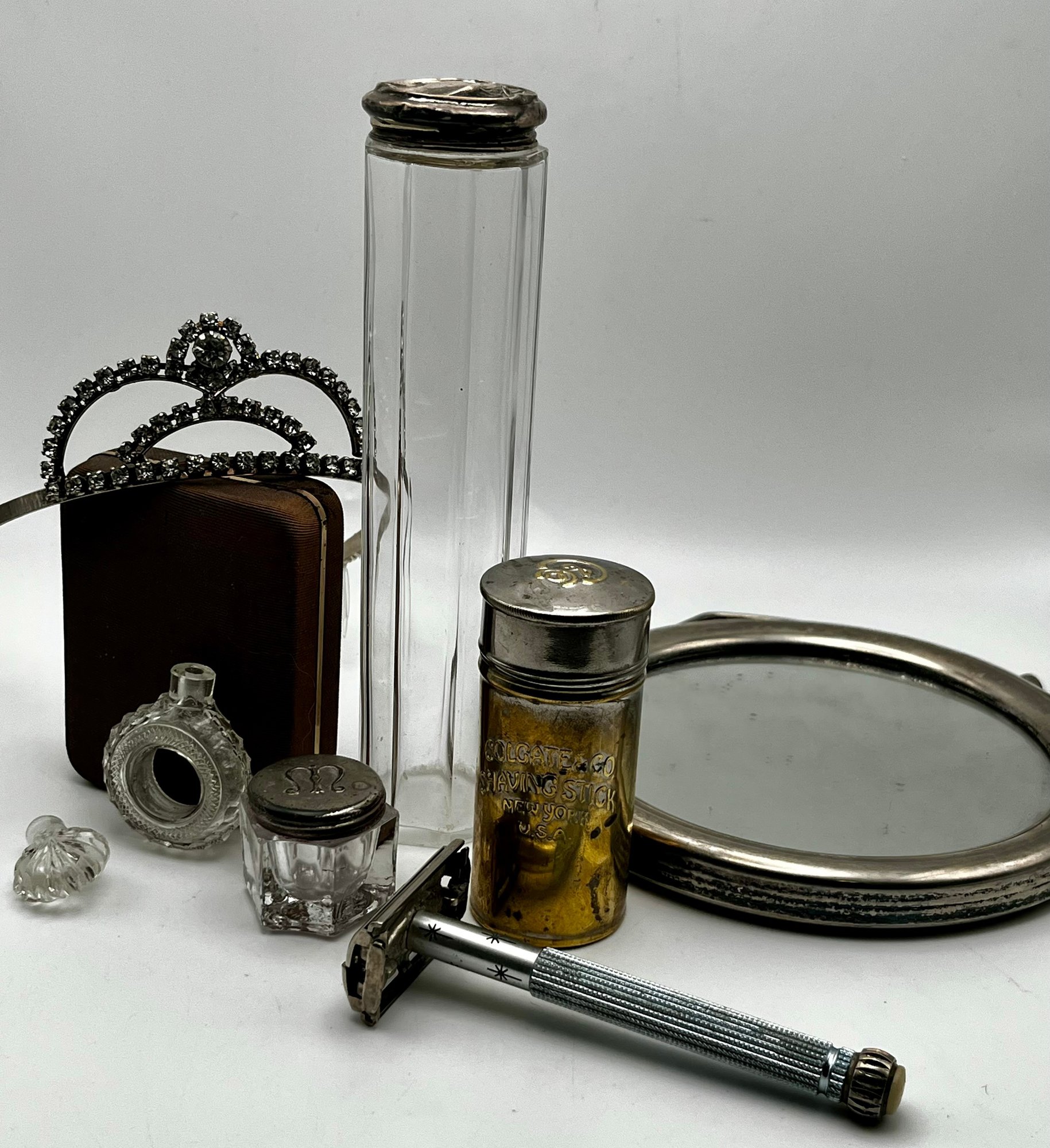 Vintage Vanity Items - Colgate Shaving , 1965 Lady Gillette, round mirror with stand, Bottles & More