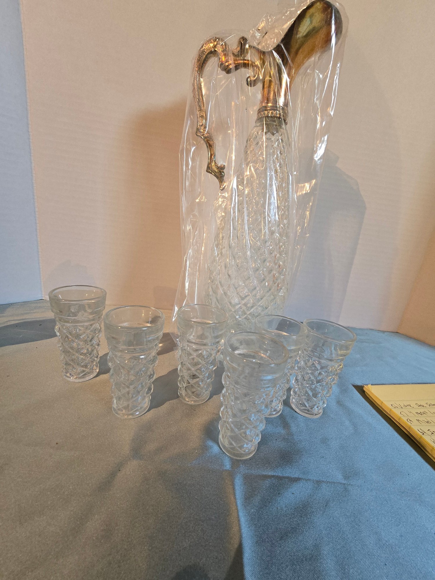 Vintage Leonard of Italy Diamond Cut Lead Crystal with Silver Neck and Handle Decanter and 6 Liquor / wine Glasses