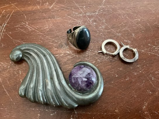 Lot (3) sterling jewelry including Mexican art deco style brooch with amethyst, Length 3.75”; adjustable ring with large charcoal color stone; pair sterling hoop earrings. Diameter 3/4”