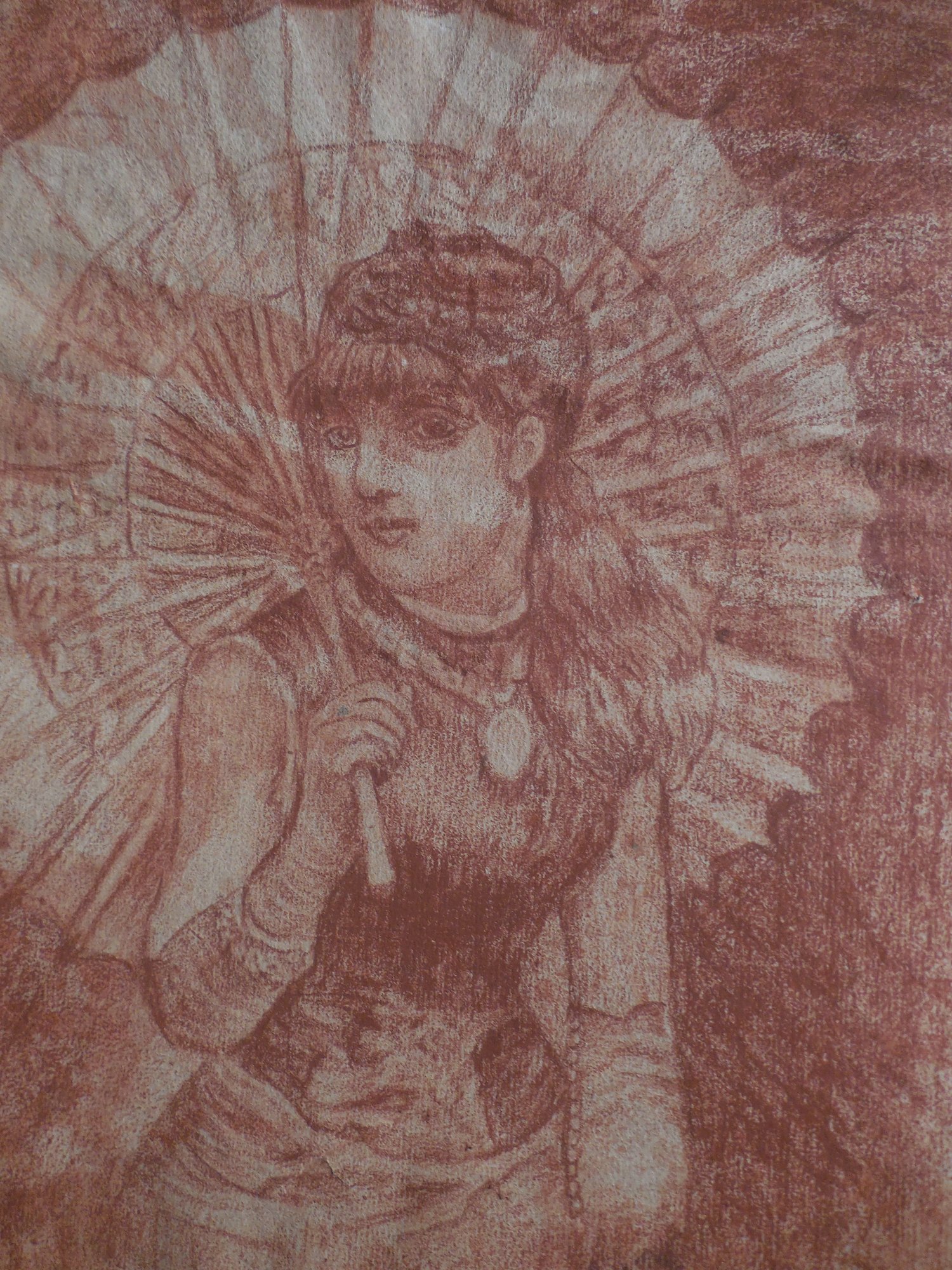 19th Century Conte Crayon Drawing of Woman Holding Parasol. Dimensions: 9" x 11".