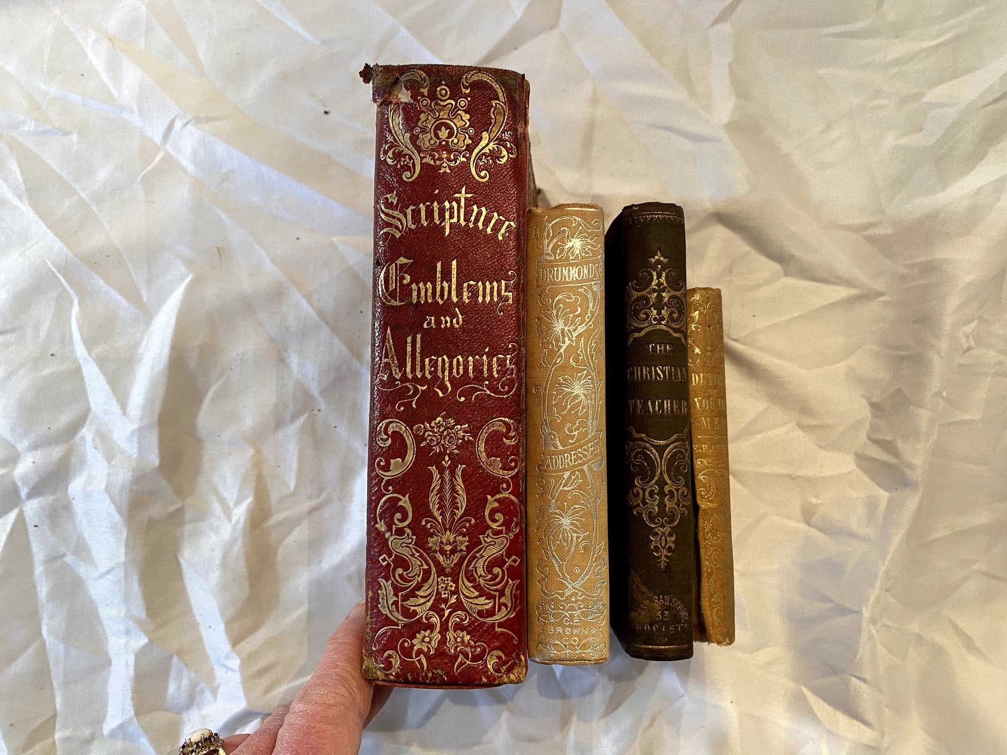 Lot of 4 books. 1) Duties of Young Men by E. H. Chapin, 1848. 2) Religious Emplems by William Holmes and John W. Barber, 1854. 3) The Christian Teacher, A Memoir of Abel Frink Kinney, A. M. by Martin P. Kinney, publishing date unknown. 4) Drummond's Addresses published byCCharles E. Brown and Company, publishing date unknown. See pictures for condition.