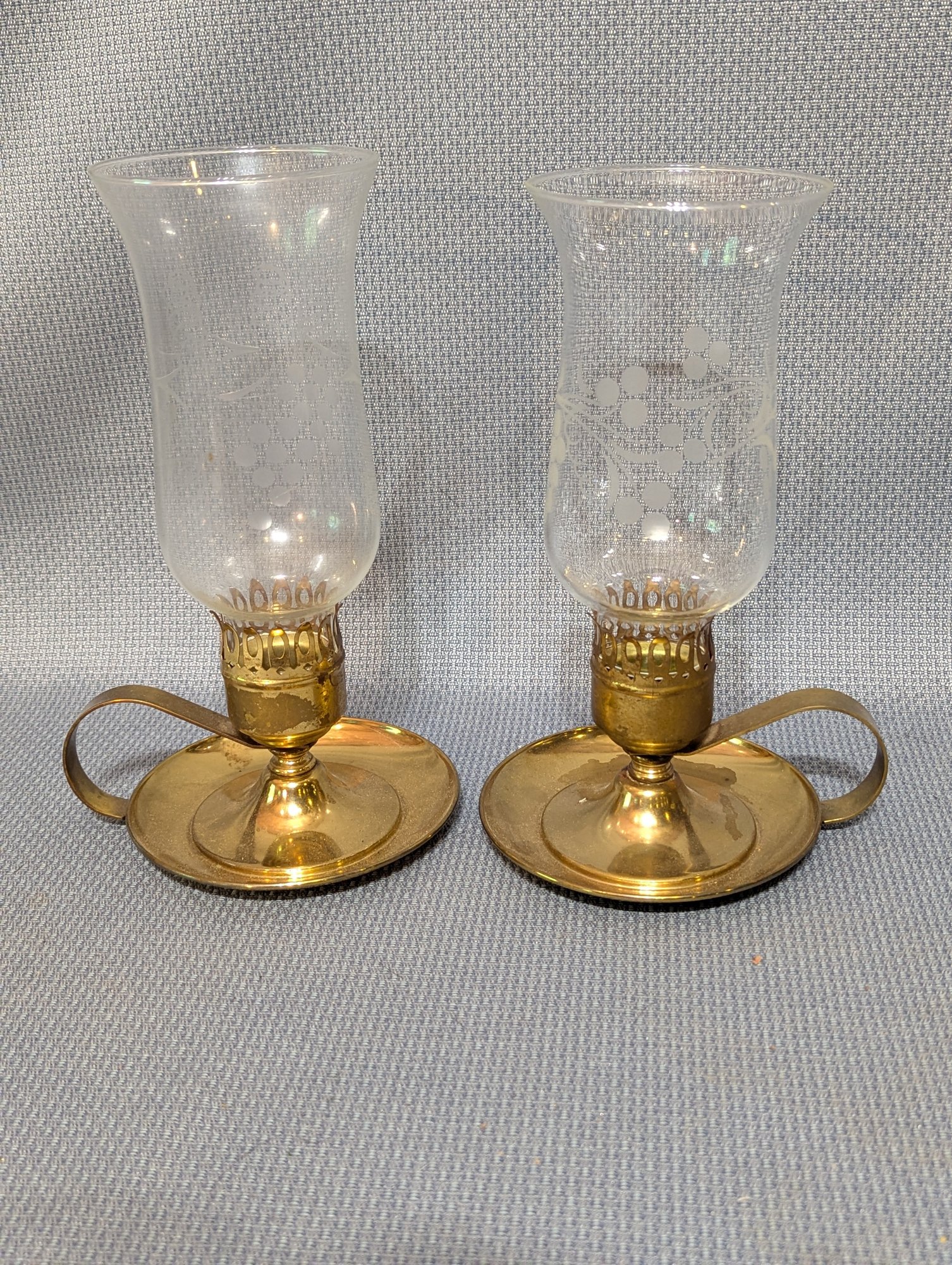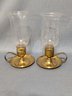 Pair of Brass Candle Sticks with Etched Glass Shades