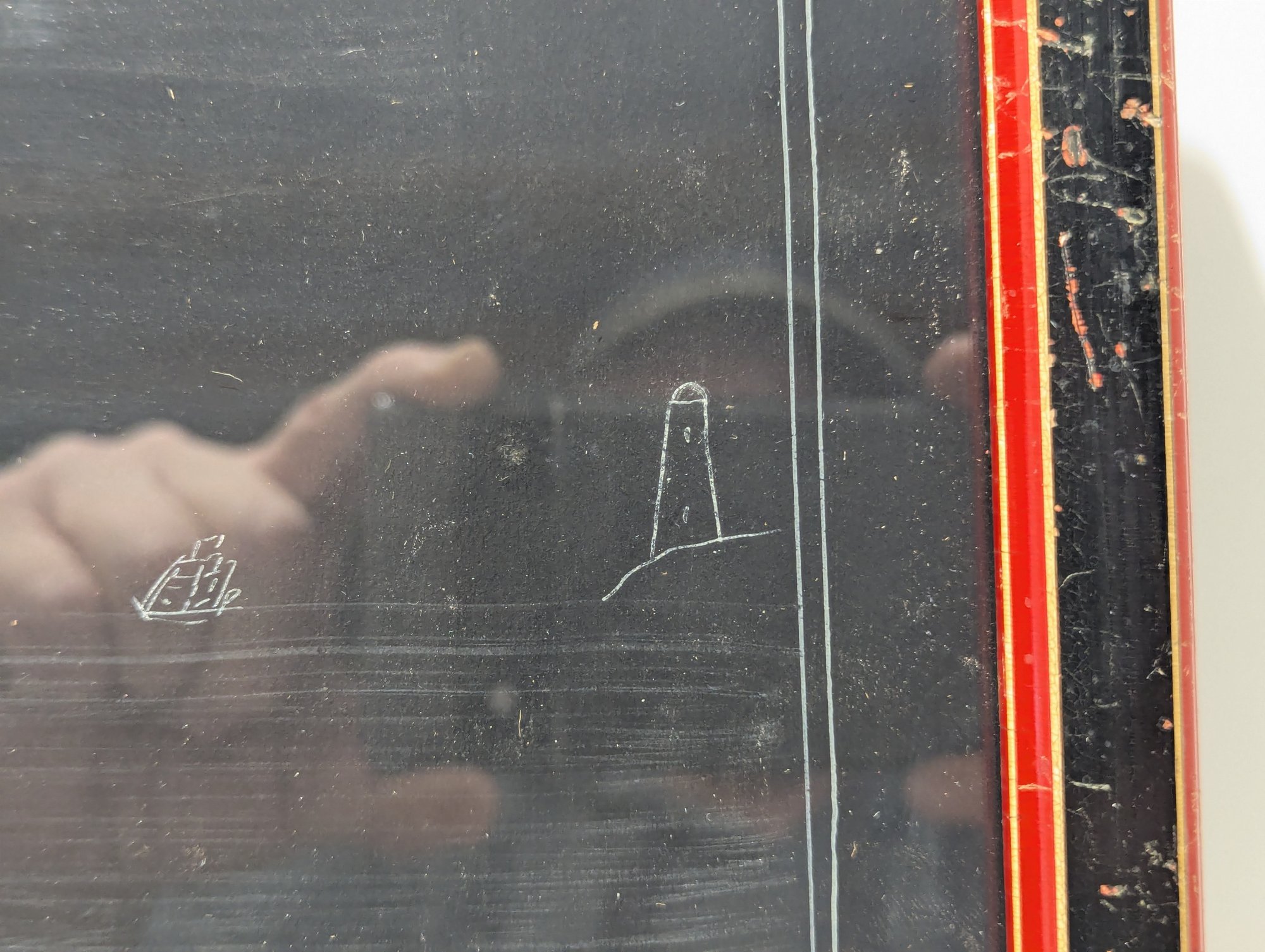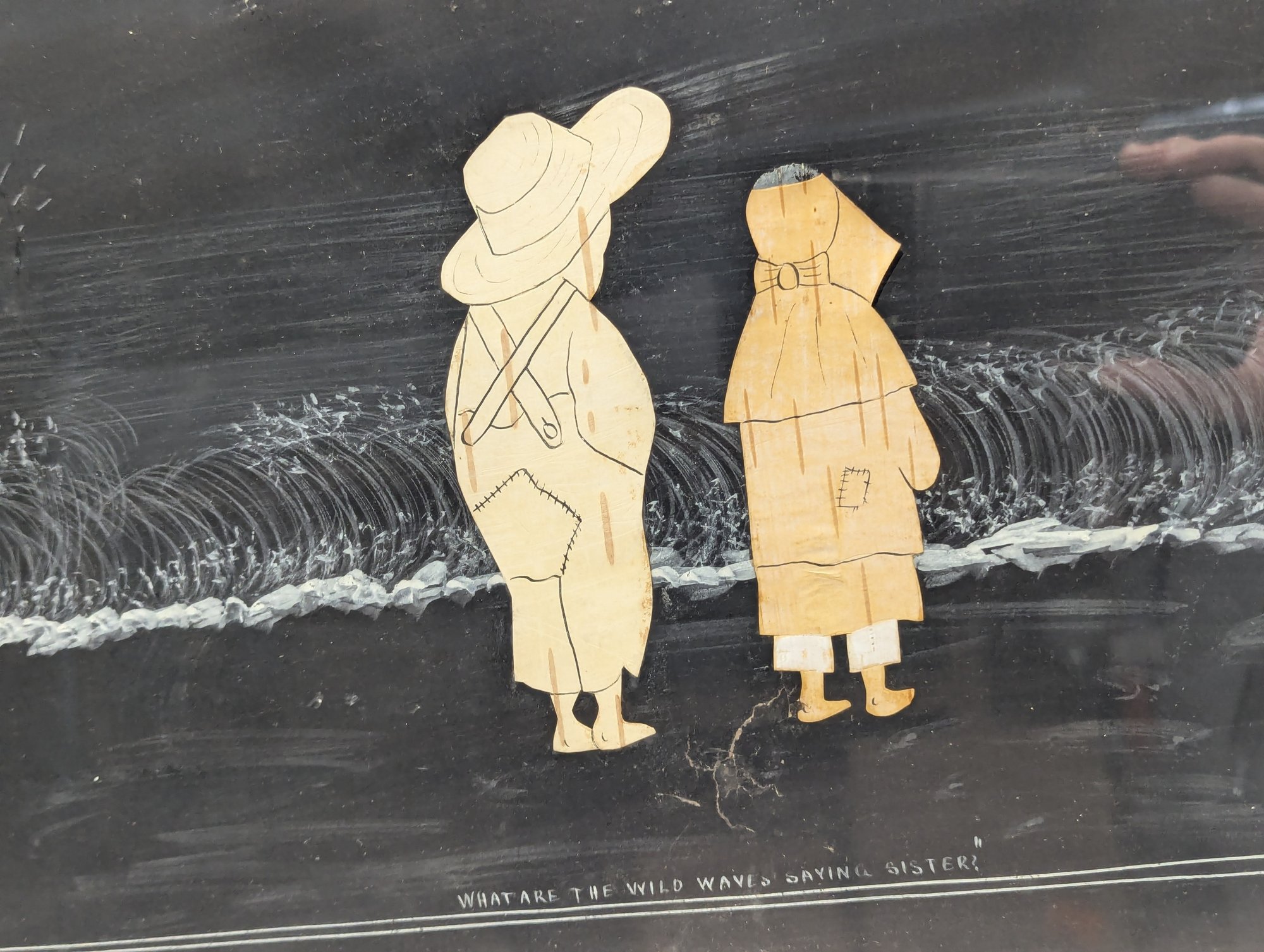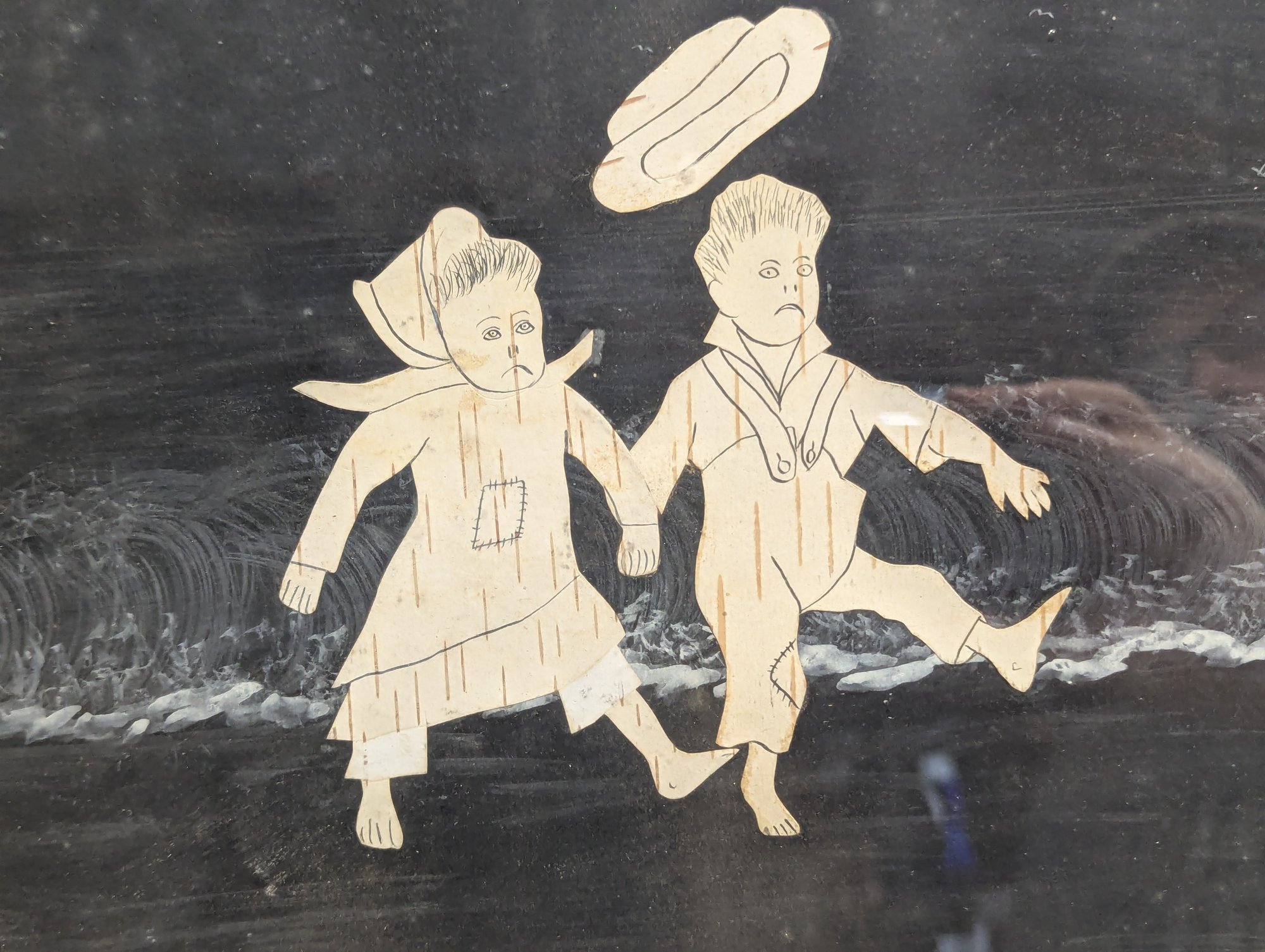 His collages used pen and ink, watercolor, white and red gouache, cut birch bark and cut paper mounted on black construction weight paper.