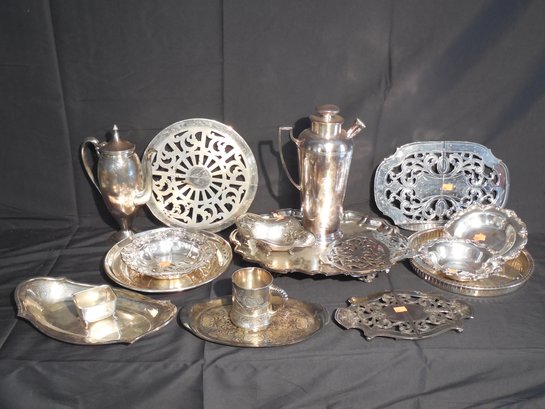 Large Lot of Silver Plate Including Trays, Trivets, Bowls, Cups, Teapot, Cocktail Shaker