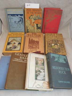 Lot of 10 Vintage Novels. Titles Include: “Black Butterflies” by Elizabeth Jordan (1927); “Treading the Winepress” by Ralph Connor (1925); “Phil Bradley At The Wheel” by Silas Boone (1915); “A Picture of New England Home Life” by Chas. Felton Pidgin (1904); “The Man from Glengarry” by Ralph Connor (1901); “Hugh Wynne Free Quaker” by S. Weir Mitchell (1911); “Resurrection Rock” by Edwin Balmer (1920); “Fisherman’s Luck” by Henry Van Dyke (1913); “Gentleman Dash” by Tertia Bennett (unknown copyright); and “Brite and Fair” by Henry A. Shute (1968). All books are in generally fair to good condition. Some have pencil writing on the first interior page. Dustjackets that are present show some wear and tear.