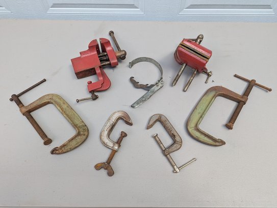 Lot of 2 Vices & C-Clamps Including a Stanley No. 700 Vise