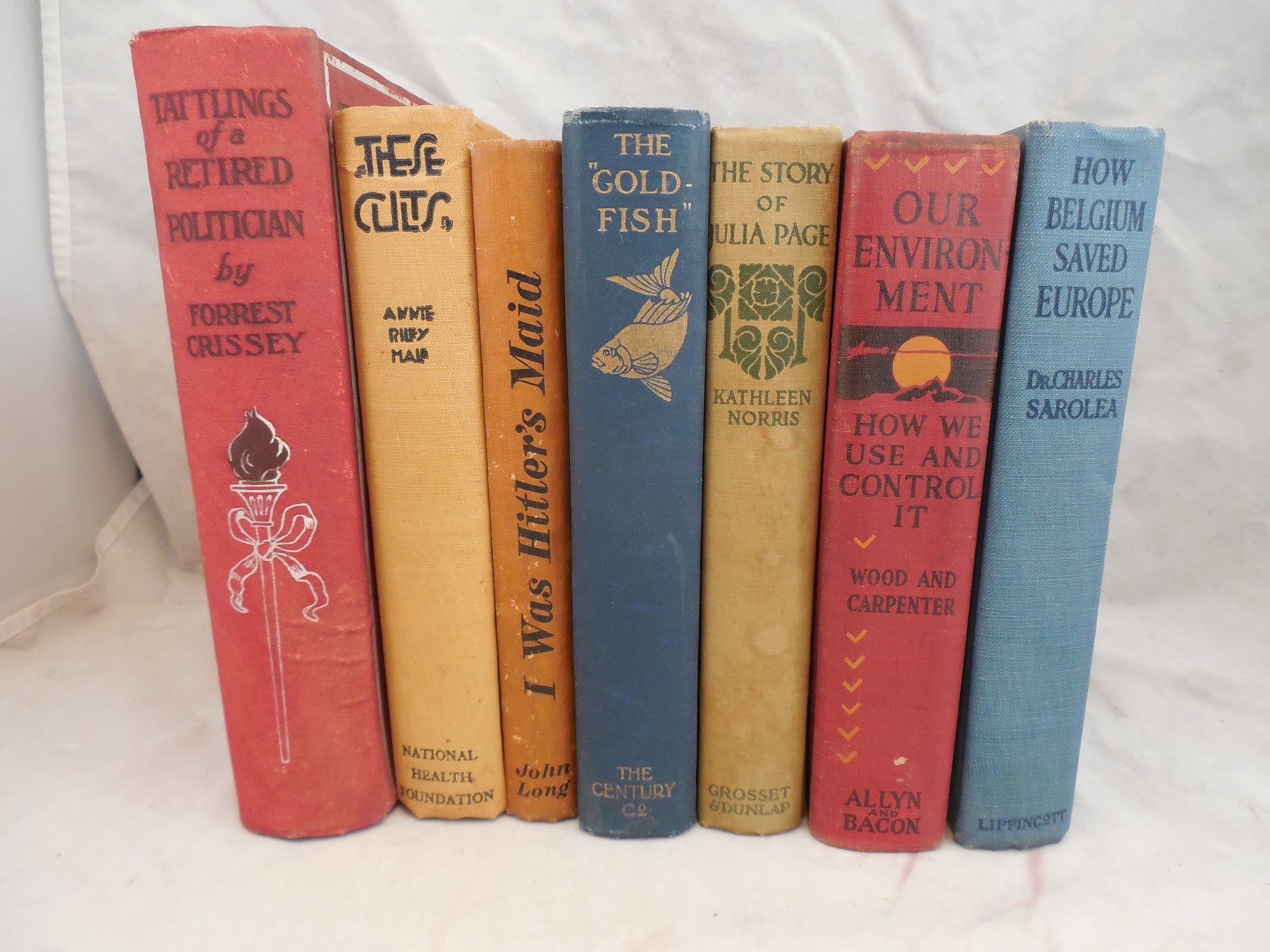 Lot of 7 Miscellaneous Vintage Nonfiction Books by Various Authors. “Tattlings of a Retired Politician” by Forrest Crissey (1904); “These Cults” by Annie Riley Hale (1926); “I Was Hitler’s Maid” by Paulin Kohler (copyright n/a); “The ‘Goldfish’” by Arthur Train (1915); “The Story of Julia Page” by Kathleen Norris (1915); “Our Environment How We Use and Control It” by George Wood and Harry Carpenter (1942); and “How Belgium Saved Europe” by Dr. Charles Sarolea (1915). All books are in age-appropriate condition with covers and pages intact.