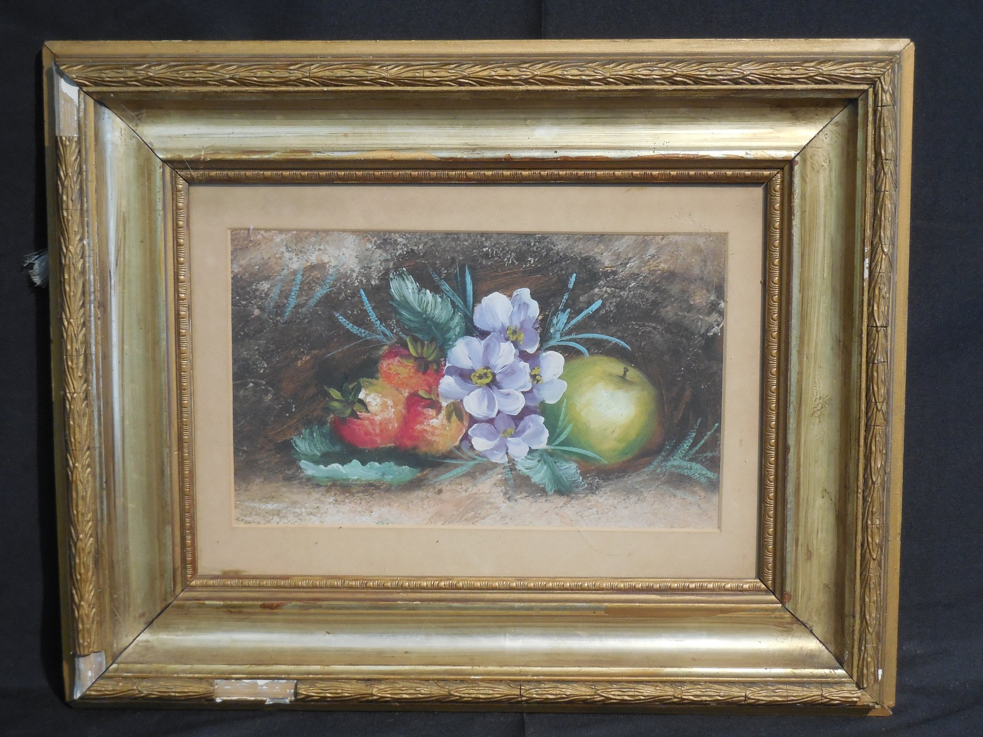 Original 19th Century Still Life Painting of Fruit and Flowers. Sight size: 9 1/2" x 6"; Total: 16" x 13". Frame has some damage but the painting appears to be good.