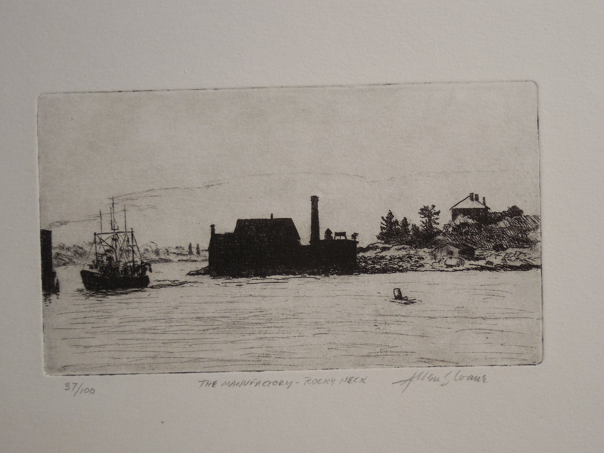 Original Artist-Signed Allen Sloane Etching called "The Manufactory - Rocky Neck" Numbered 37/100. Dimensions: 10 1/2" x 13 1/2".