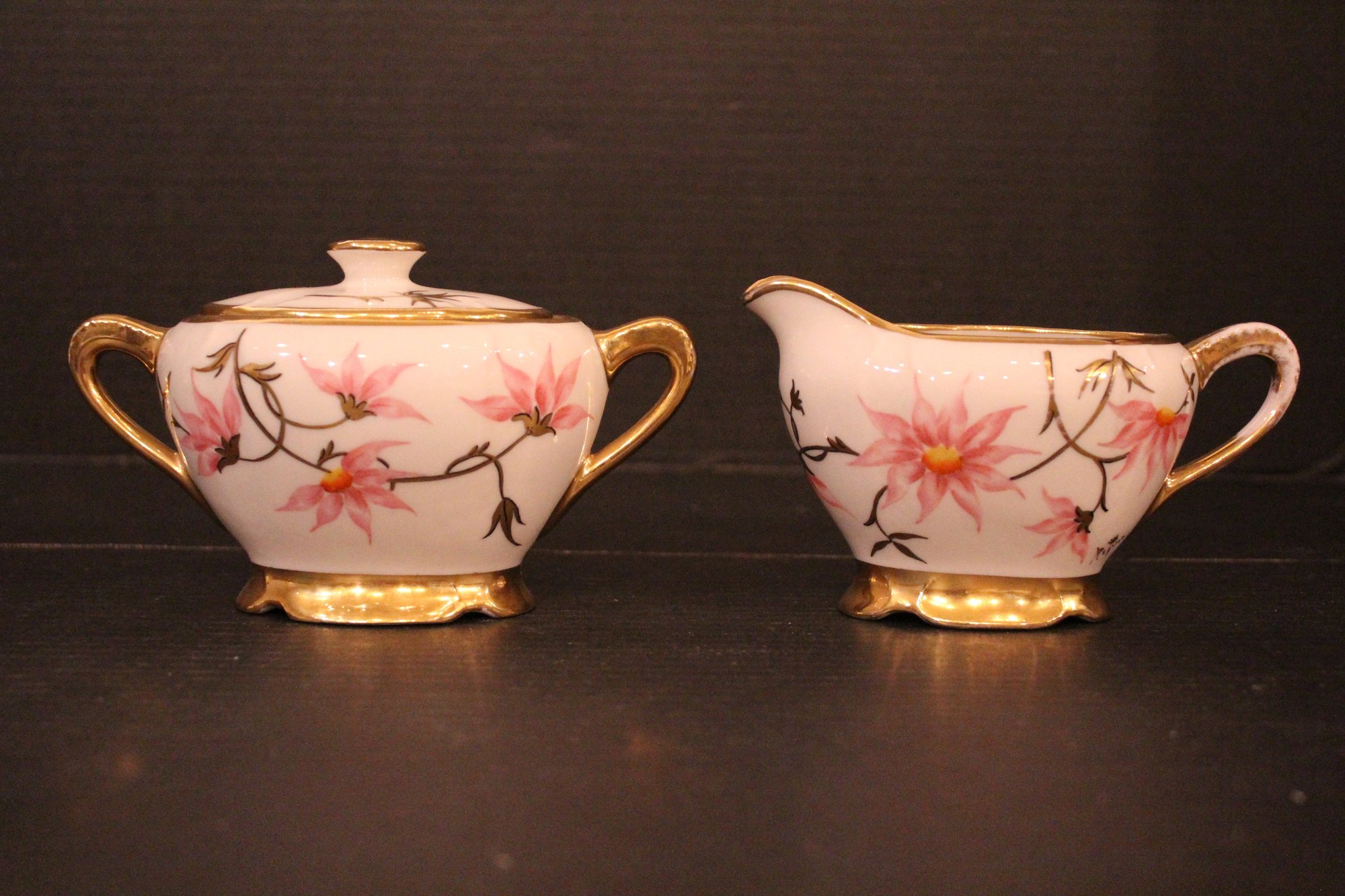 Stouffer Fine China hand painted floral porcelain cream and sugar dishes. Each about 6 inches wide.