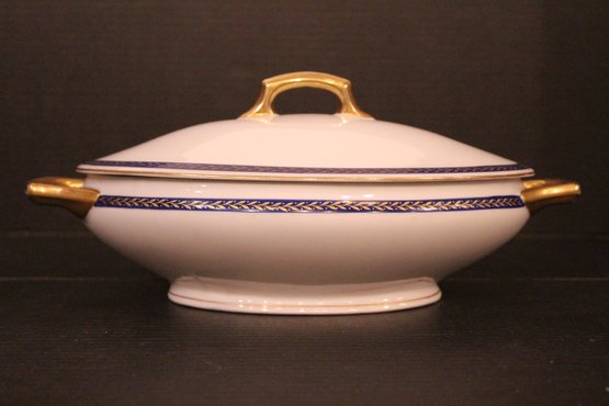 Vintage Hutschenreut Her Soup Terrine. A sleek and elegant piece with a painted blue robin beneath a gold vine or leaf like detailing along edges and gold painted handles. This item ships.