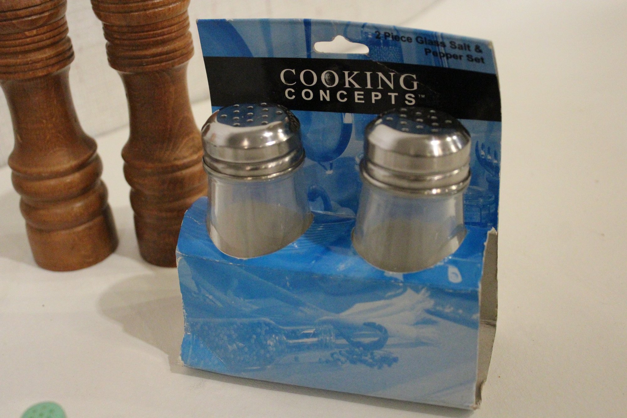 A glass shaker at 4" tall, ( NO LONGER IN LOT a small wood shaker at 3"), matching tall dark wood salt and pepper shakers at 4.5" tall. A wood cutting board at 12" x 8", 4 saucers at 6", and a white jar at 6" tall. 4 mini shakers at 2" tall (ROUND WHITE SHAKER NO LONGER IN LOT, 3 MIMI SHAKERS), matching wood grinders/shakers at 6.5" tall, and new glass shakers at 4.5" tall. These items can be shipped.