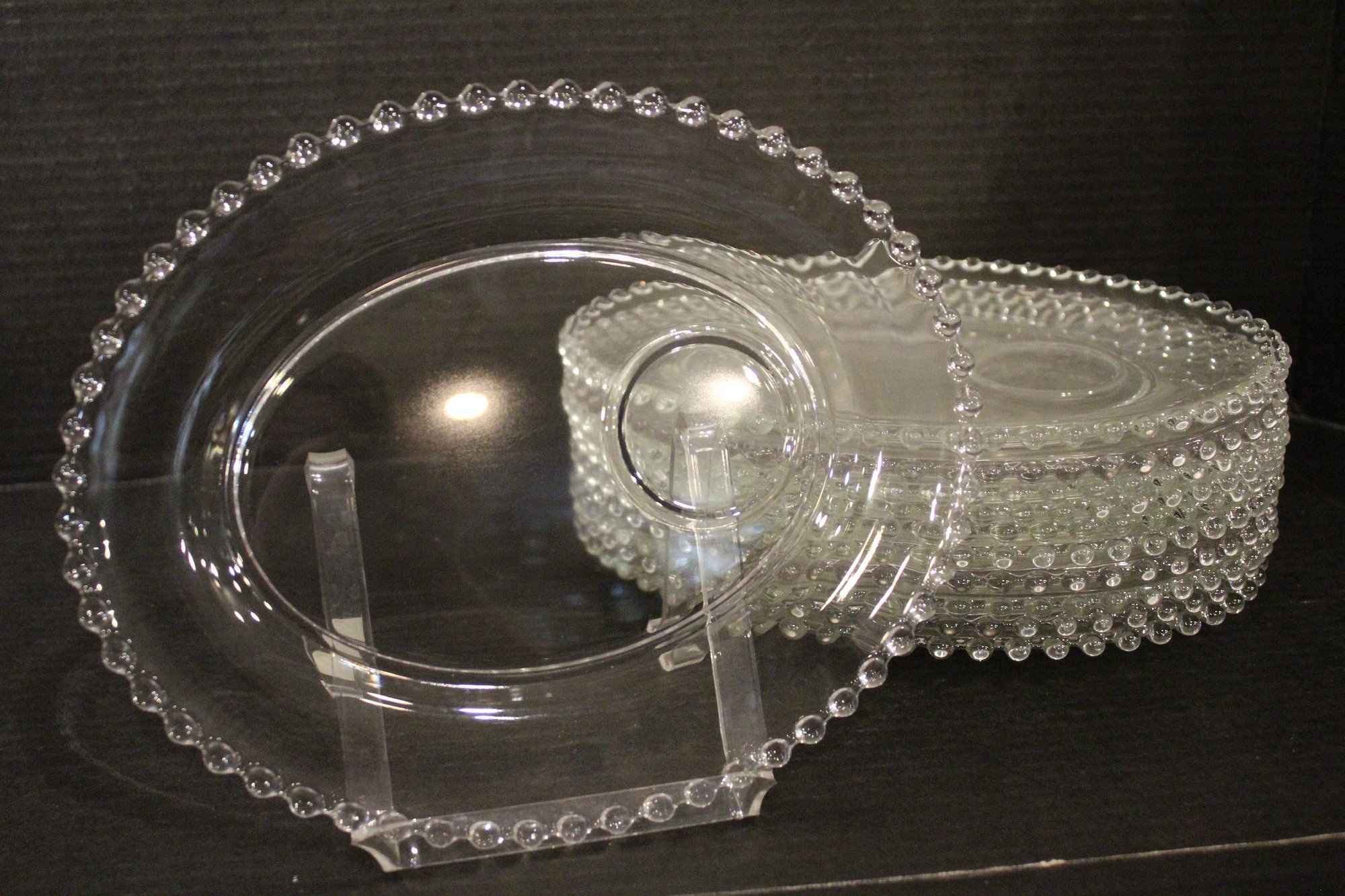 A set of 11 vintage candlewick snack trays/lunch plates, 9.5" x 8". The cups are not included and only for display purposes. These items can be shipped.