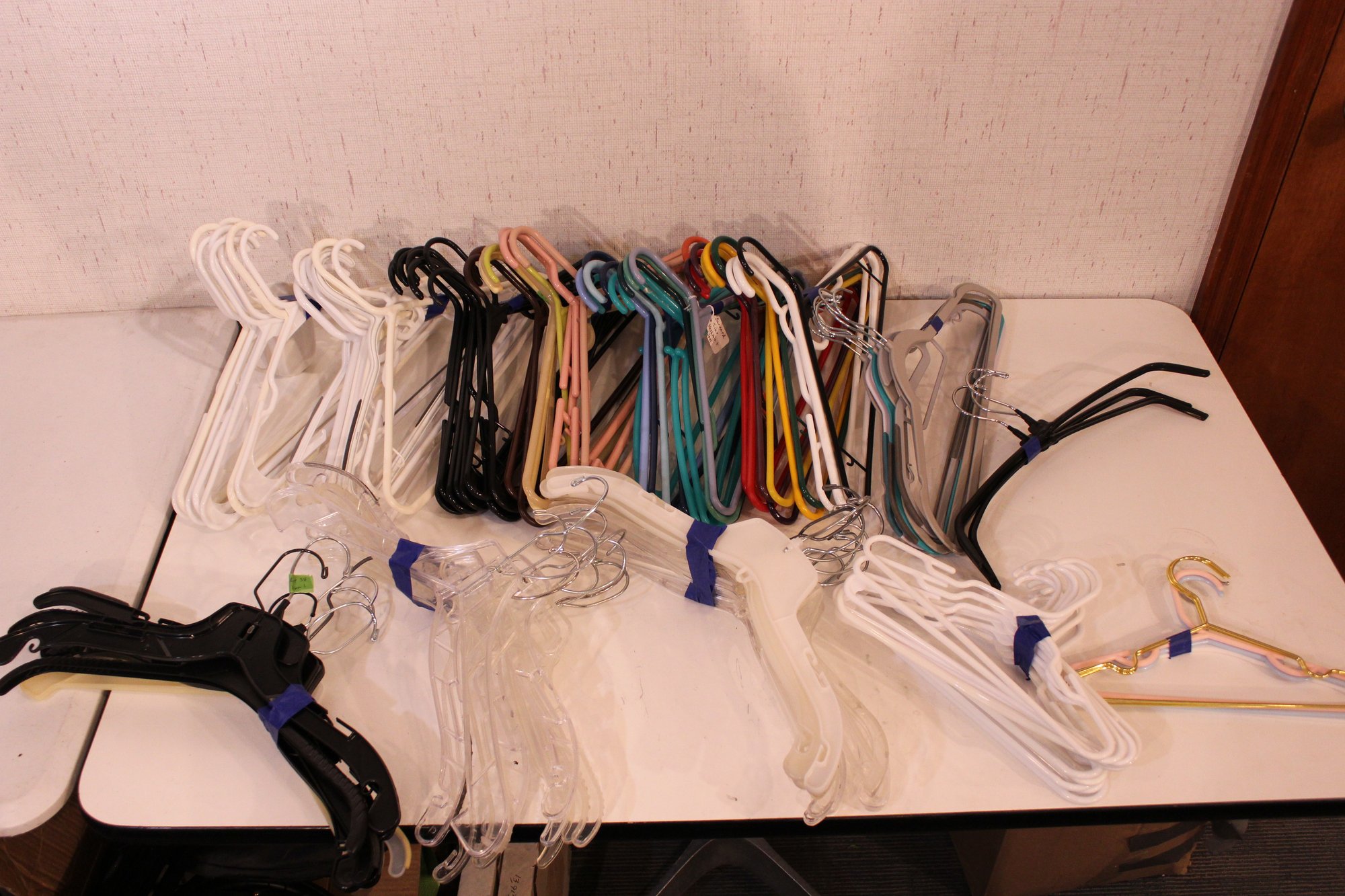 A lot of 115 hangers in total. All bundles of hangers shown are bundles of 10 except for a few specified. 20 white plastic hangers, 10 black plastic hangers, 8 flat plastic hangers, 3 metal rubber hangers, 10 black plastic or metal hangers, 10 clear plastic and metal hangers, 10 white/clear plastic and metal hangers, 10 white small plastic hangers, 2 gold small hangers, and 2 colorful small plastic hangers. These items can be shipped.