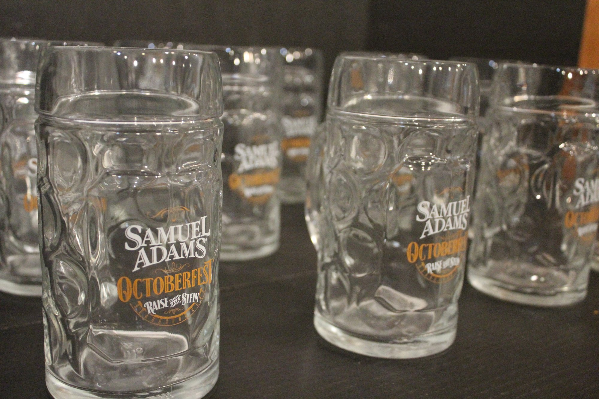 A set of 12 sturdy thick glass Samual Adams textured glass October Fest beer mugs, with 17 assorted bottle openers. These items can be shipped.