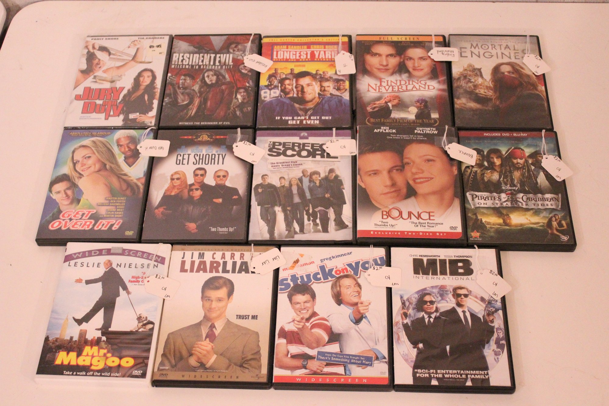 A collection of 14 DVD's featureing; Jury Duty (1995), Resident Evil: Welcome to Raccoon City (2021), The Longest Yard (2005), Finding Neverland (2004), Mortal Engines (2018), Get Over It (2001), Get Shorty (1995), The Perfect Score (2004), Bounce (2000), Pirates of the Caribbean: On Stranger Tides (2011), Mr. Magoo (1997, Liar Liar (1997), Stuck on You (2003), Men in Black: International (2019). These items can be shipped.
