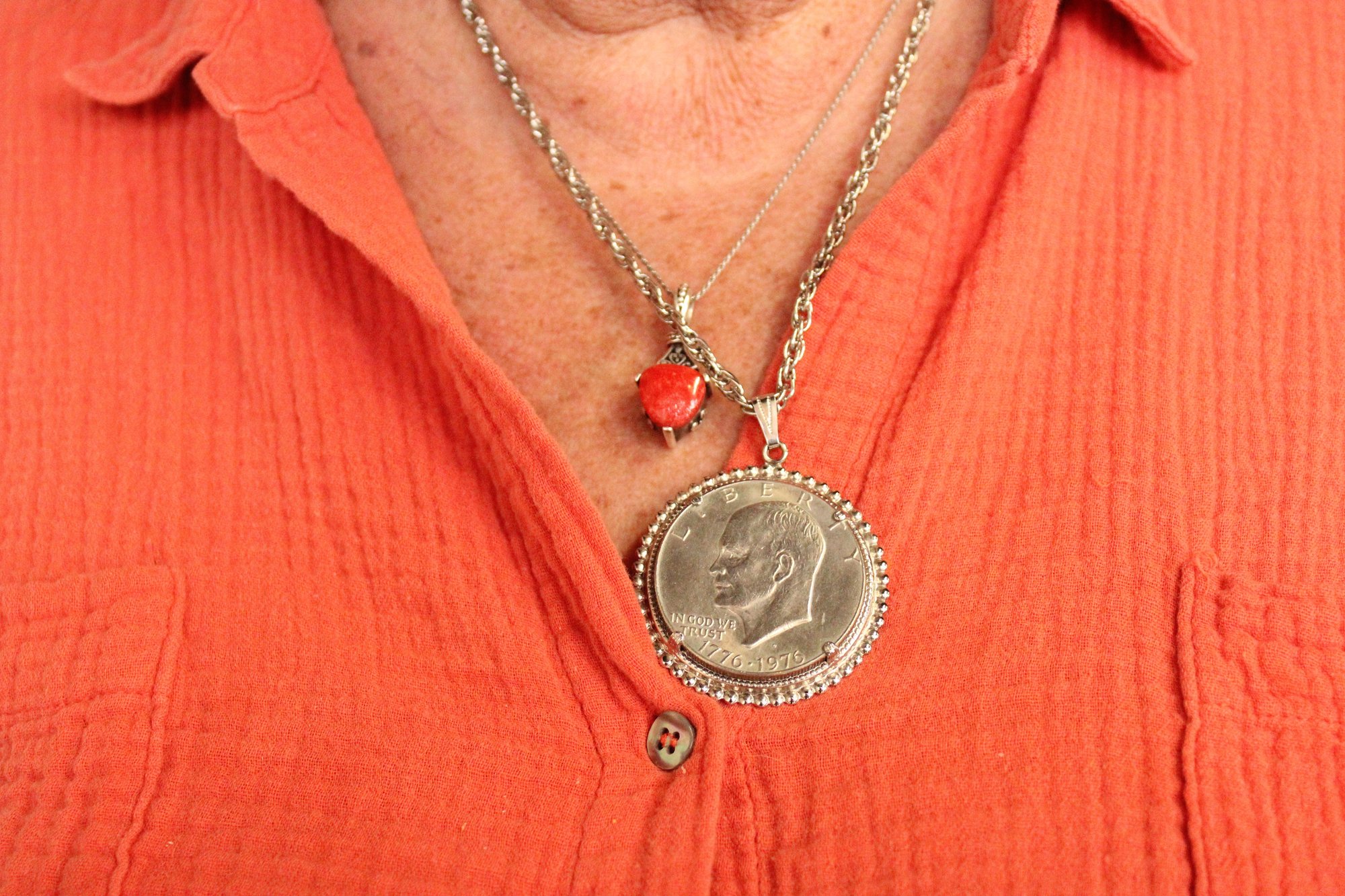 A second real 1976 U.S. silver dollar coin in an ornate clamp for a bold and unique pendant necklace on a 24" rope chain. This item can be shipped.