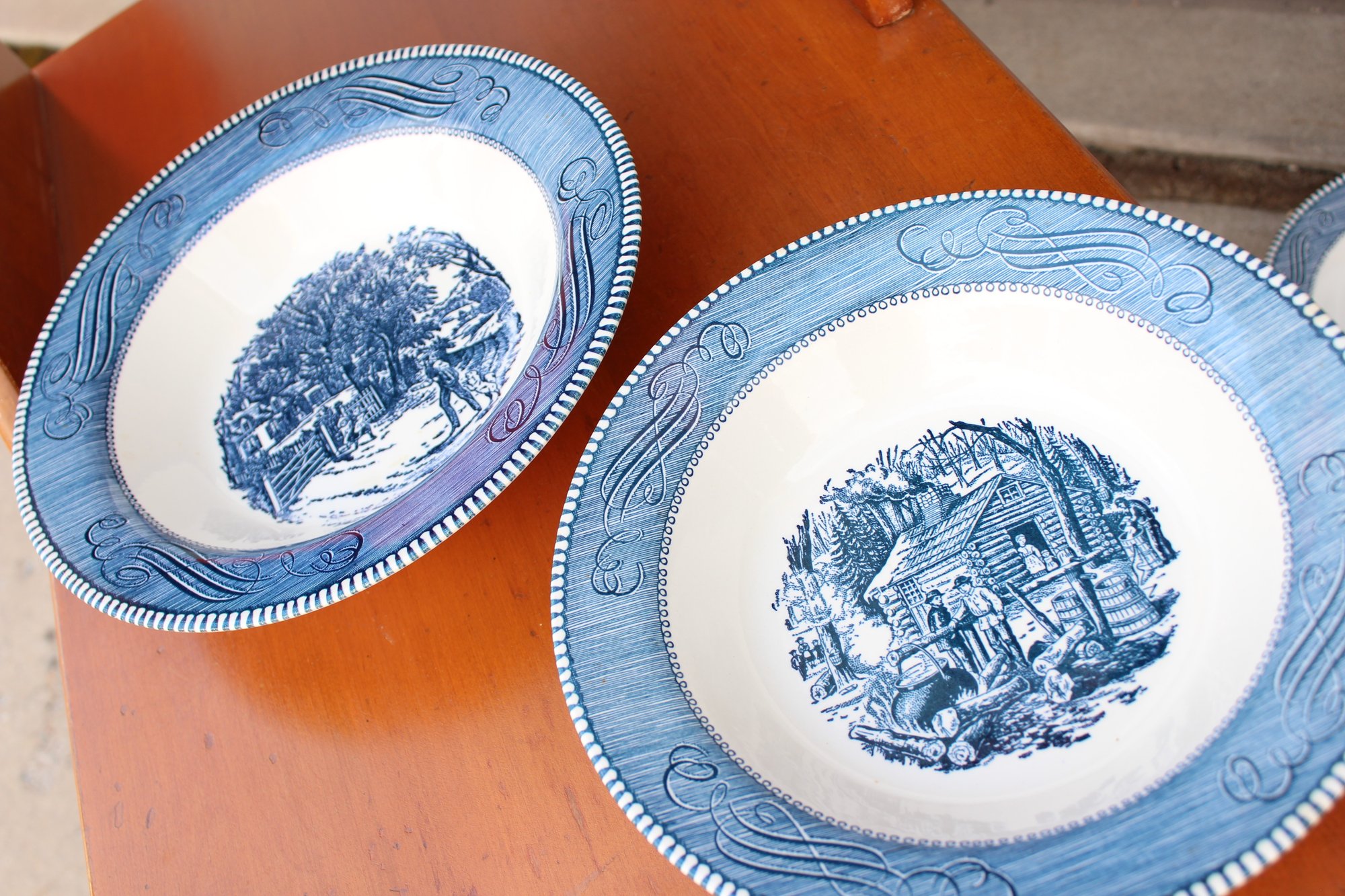 2 10" Currier & Ives "Maple Sugaring" Vegetable Bowls. 1 bowl is chipped on the rim as show in the photos