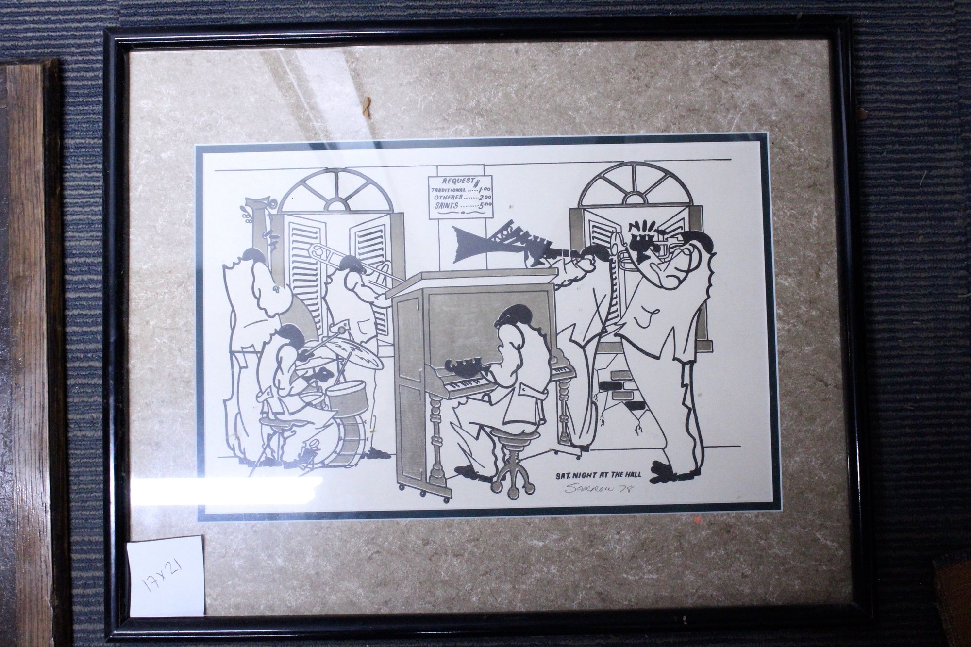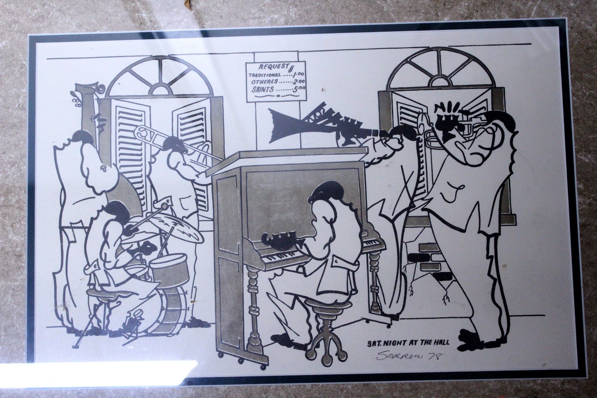 framed black and white print is a piece of New Orleans jazz history by the artist William Sorrow.