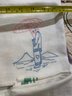 Hand embroidered white hand towel that is 30 x 17 inches and printed tan hand towel, 29 x 14.
