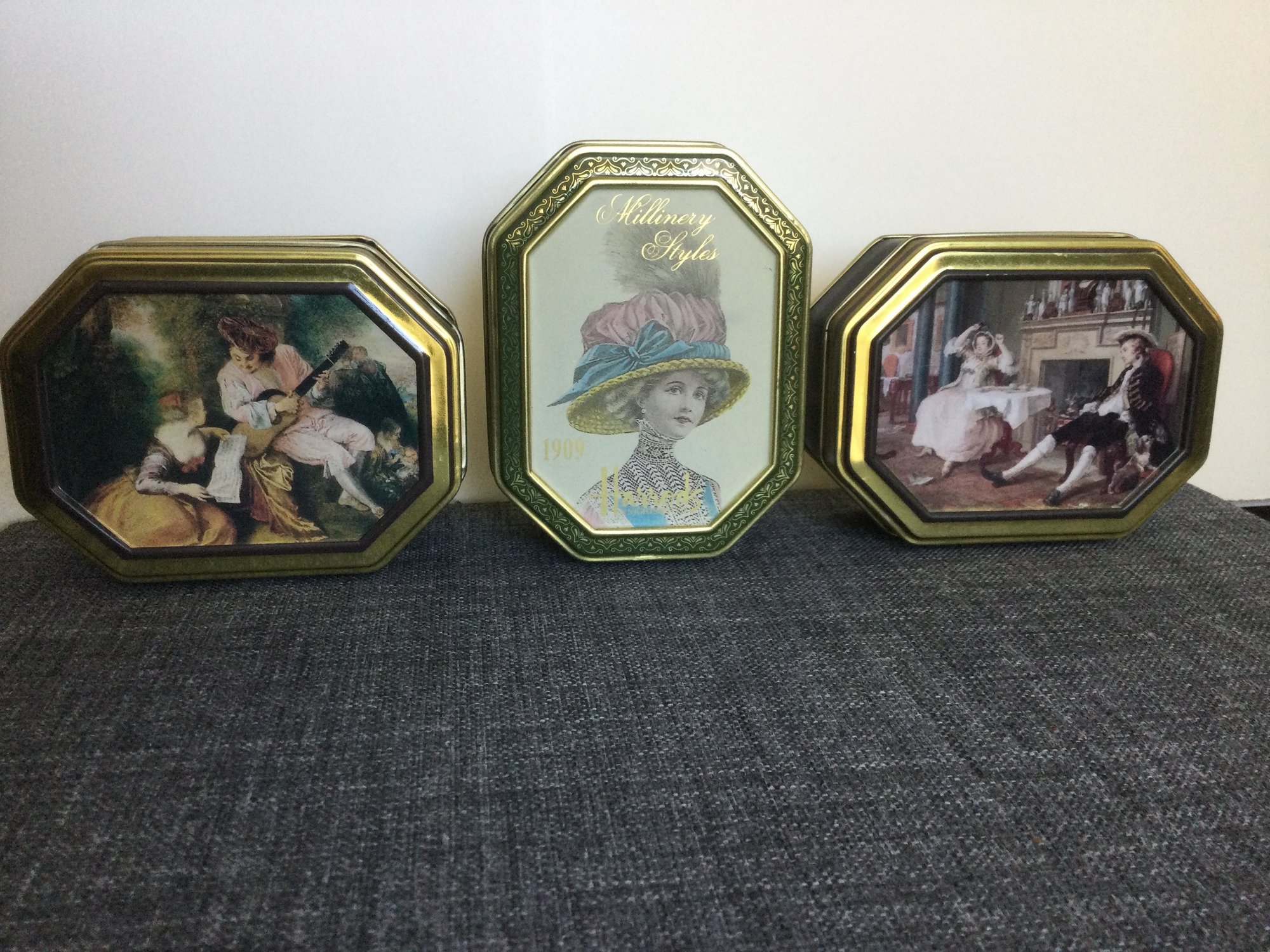 Collectible tins made in England - One of the Churchill’s of London tins is Jean Antoine Watteau 1684 - 1721 The Scale of Love and the other is William Hogarth 1697 - 1764. The Harrods is Millinery Styles from the original illustrations taken from the Harrods “Fashionable Rendezvous” catalogue, 1909.