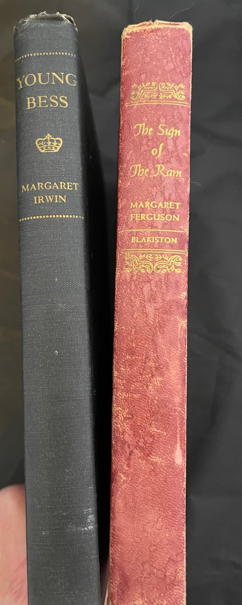 Young Bess by Margaret Irwin , and The Sign of the Ram by Margaret Ferguson. Both printed in 1945; one is a "Wartime Book" which was printed in compliance of wartime paper shortages