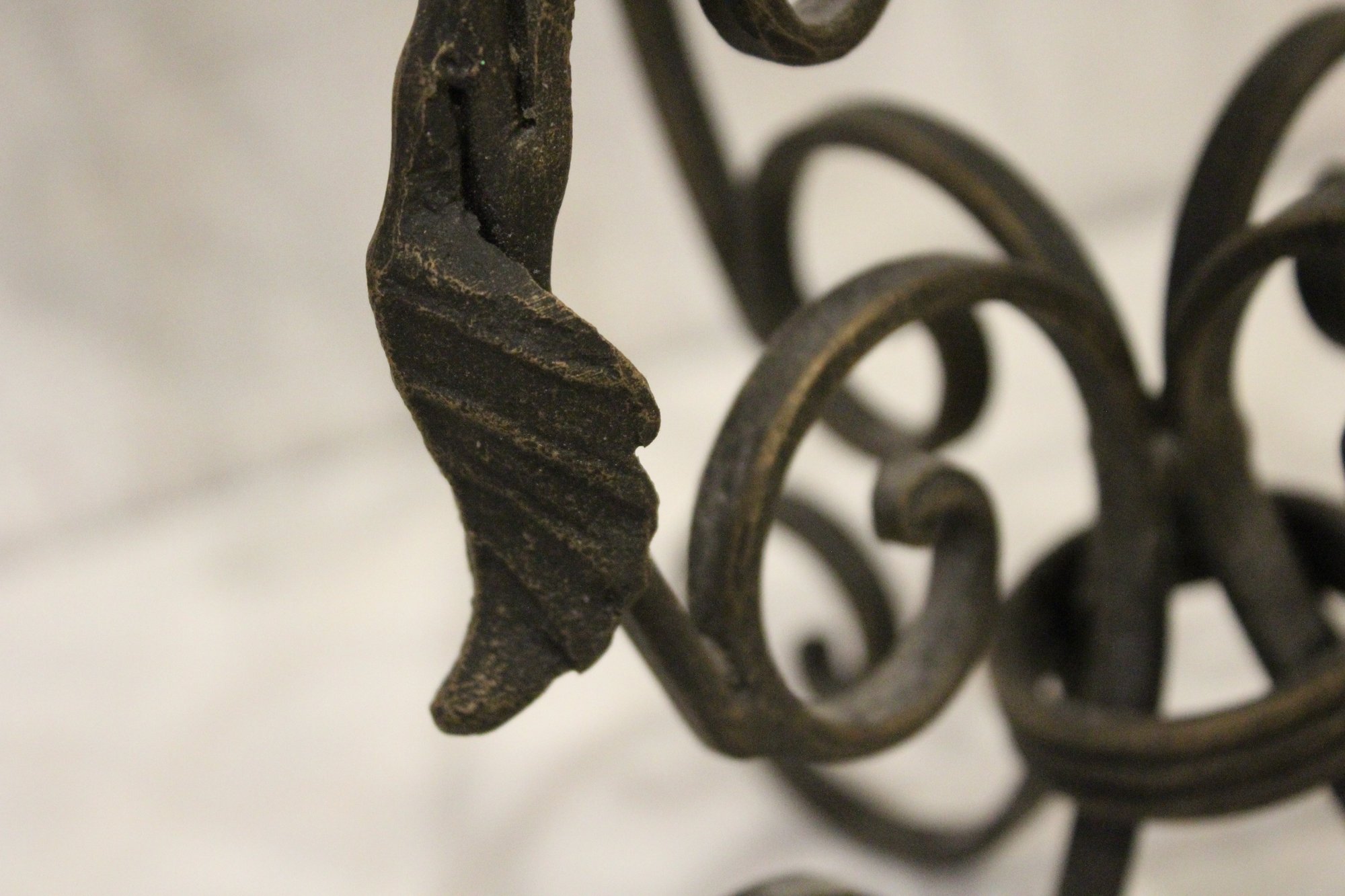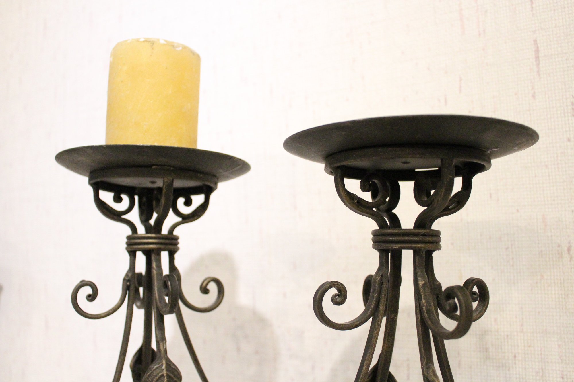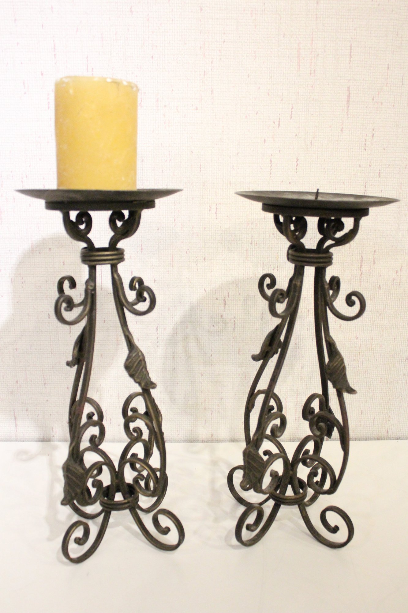2 matching decorative iron candle holders adorned with metal leaves and one candle, 14.5". These items can be shipped.