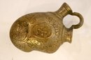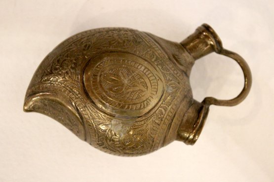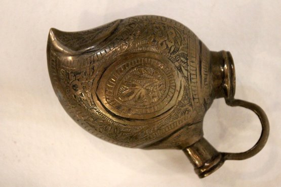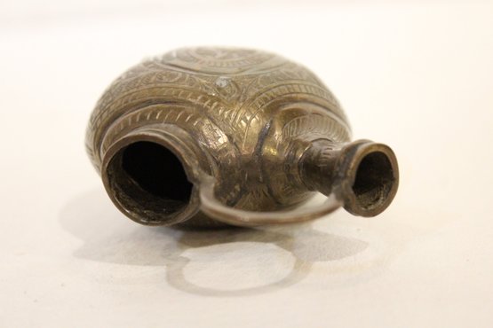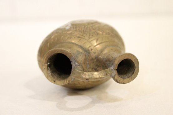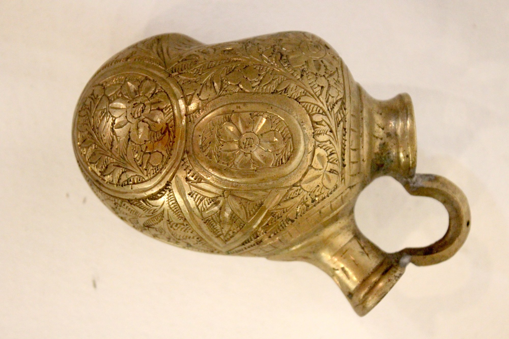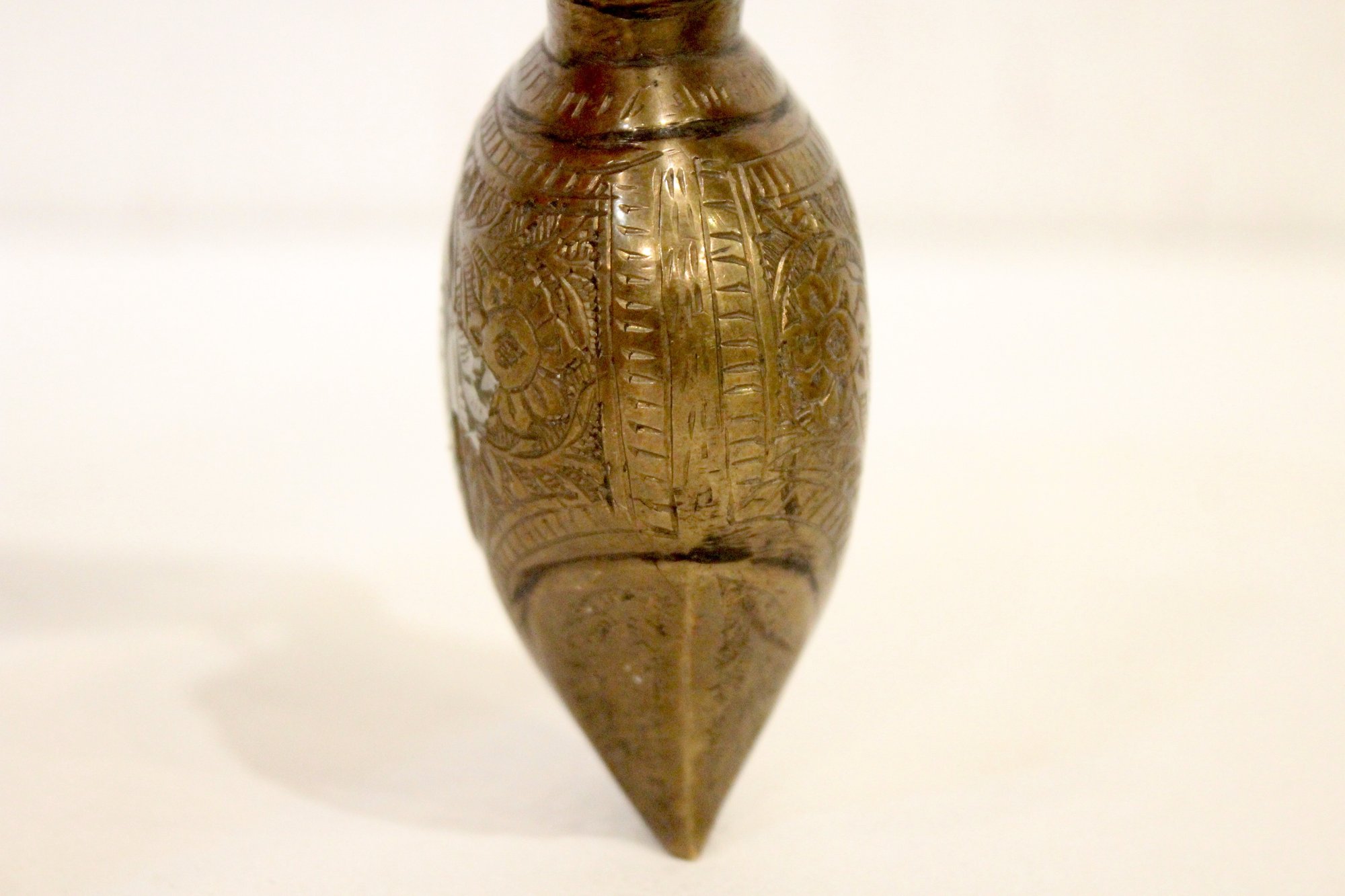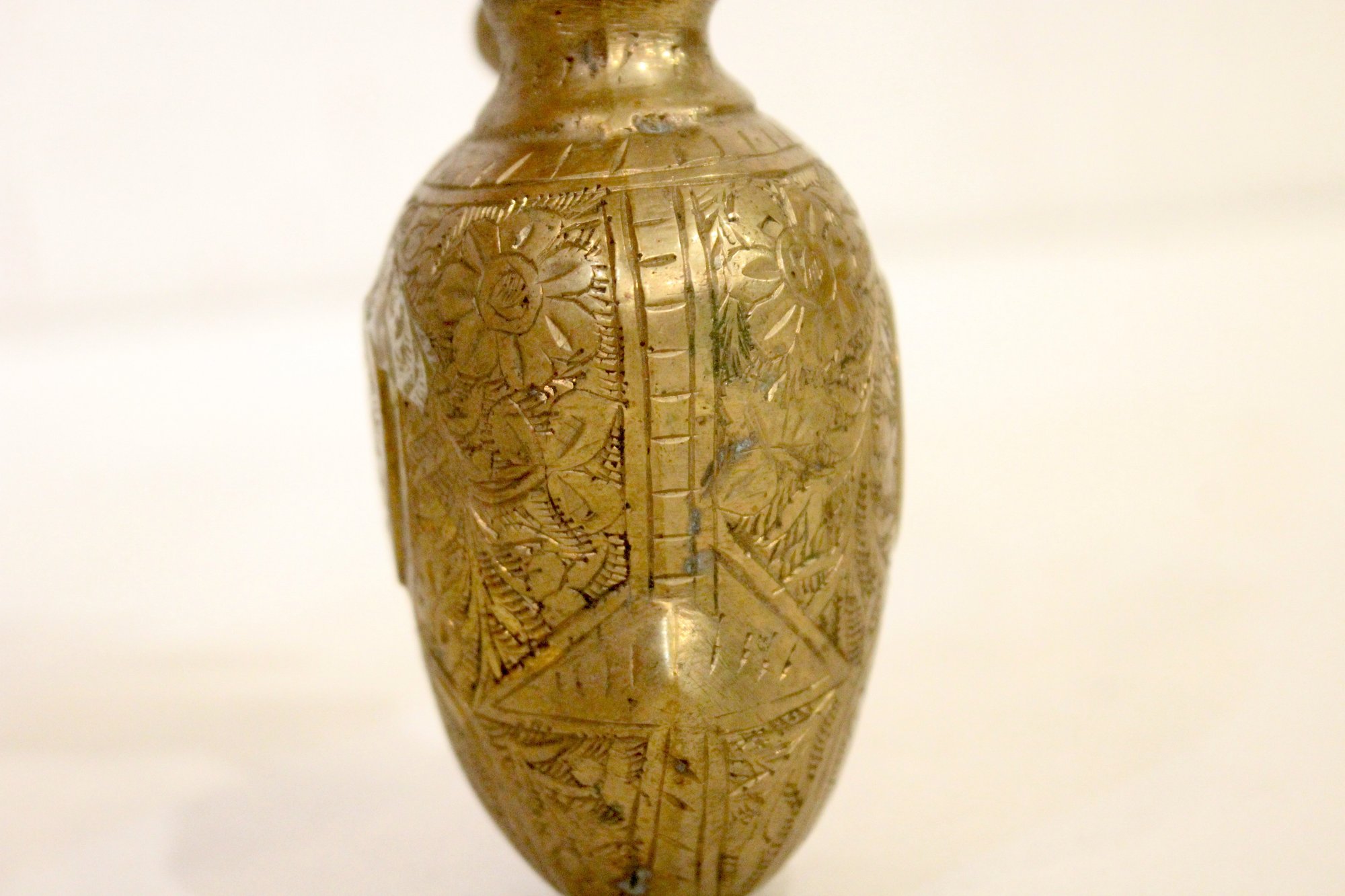 2 antique Indian or Middle Eastern engraved brass vessel Hookah Bases, 4.5", 5"