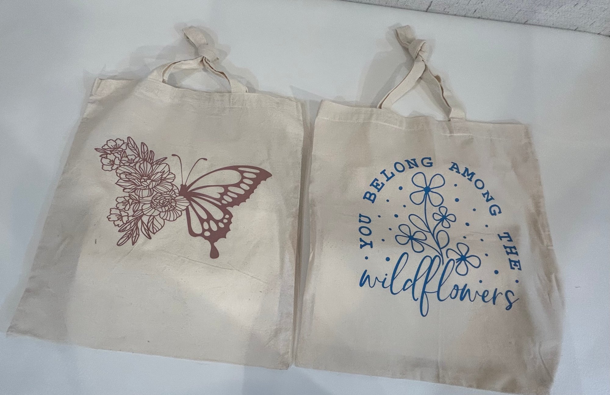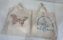 16 by 15 inch cloth totes, one with a butterfly and the other with wildflowers
