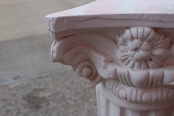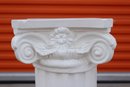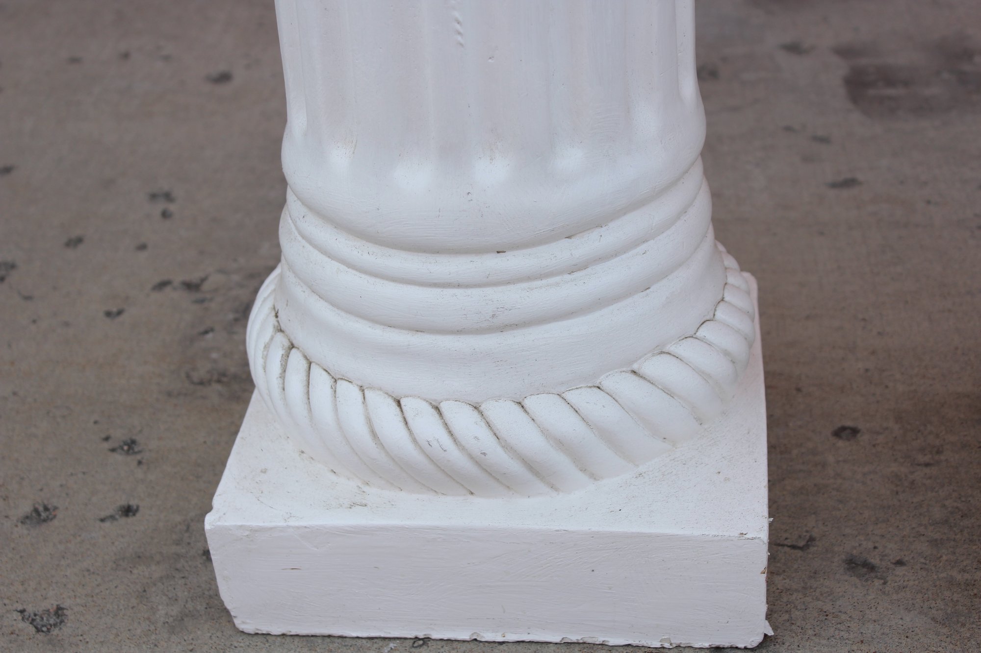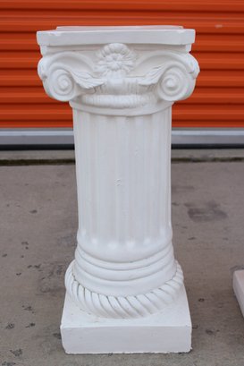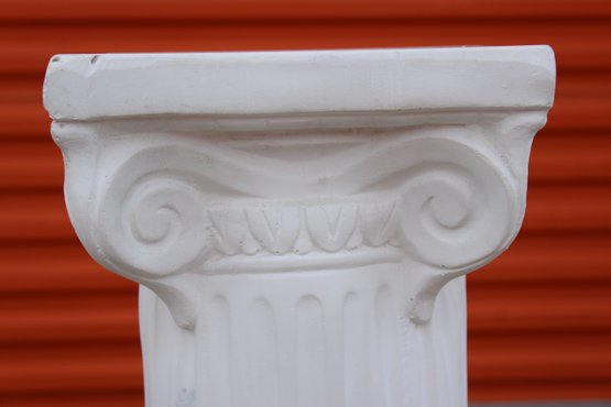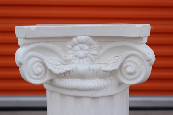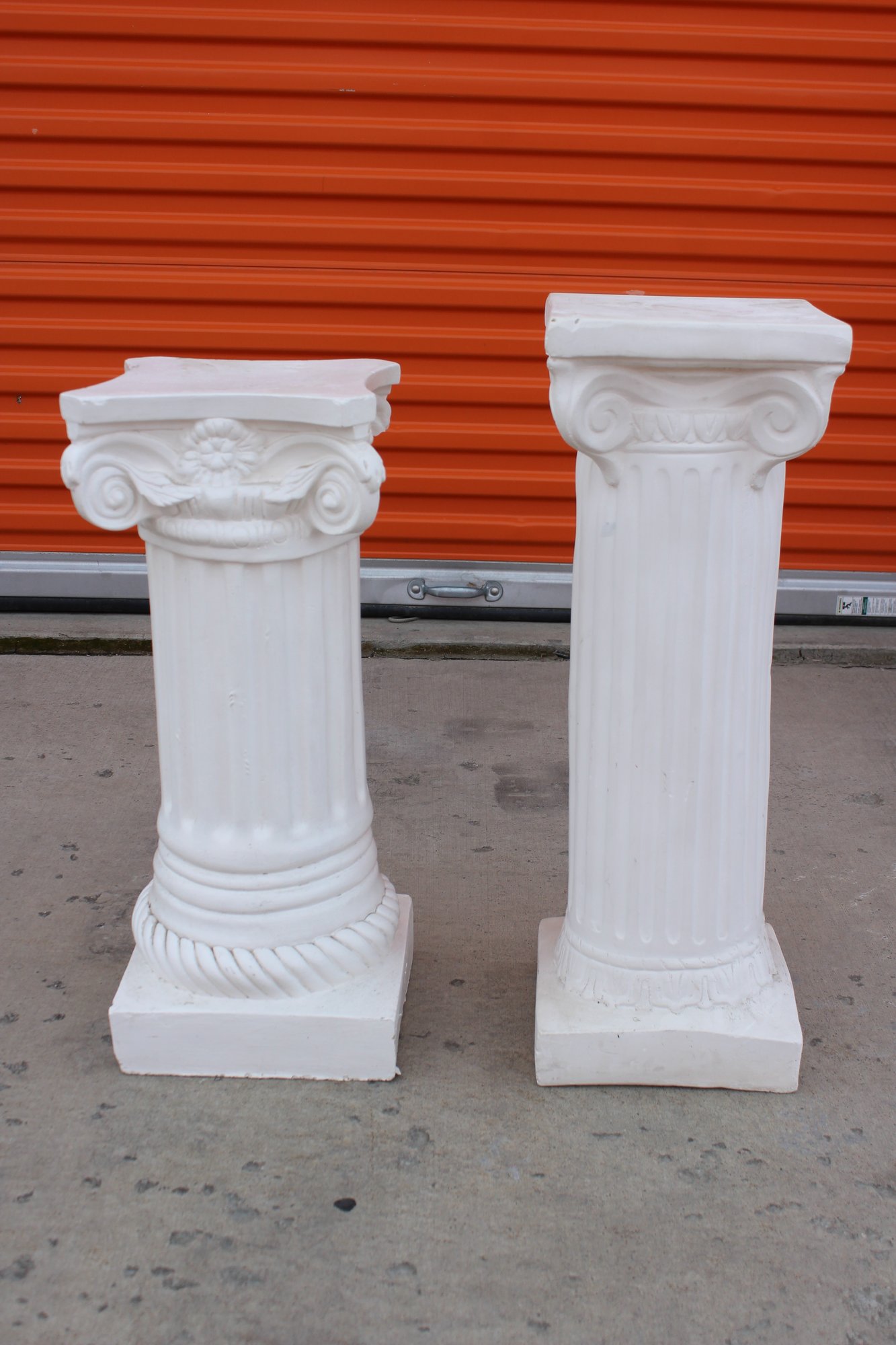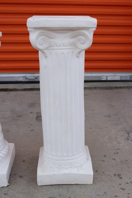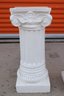 2 small white decorative Roman or Greek style column pedestals, 26" x 10" and 28" x 10". The shorter column has damage on one upper corner as pictured. These items can not be shipped.