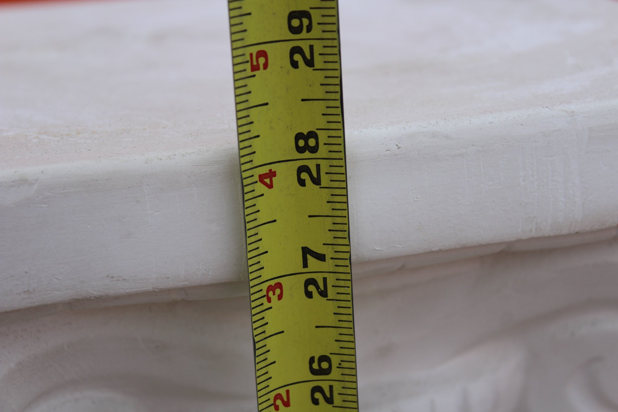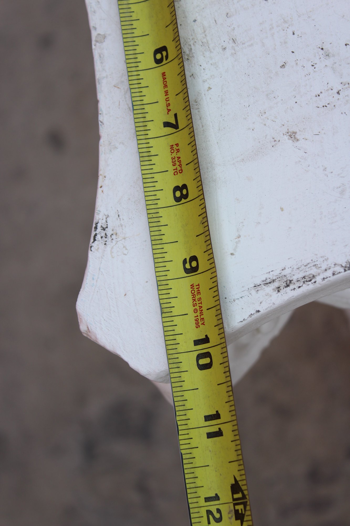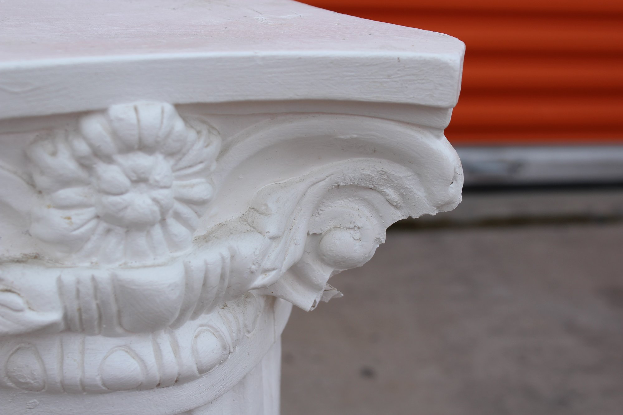 2 small white decorative Roman or Greek style column pedestals, 26" x 10" and 28" x 10". The shorter column has damage on one upper corner as pictured. These items can not be shipped.