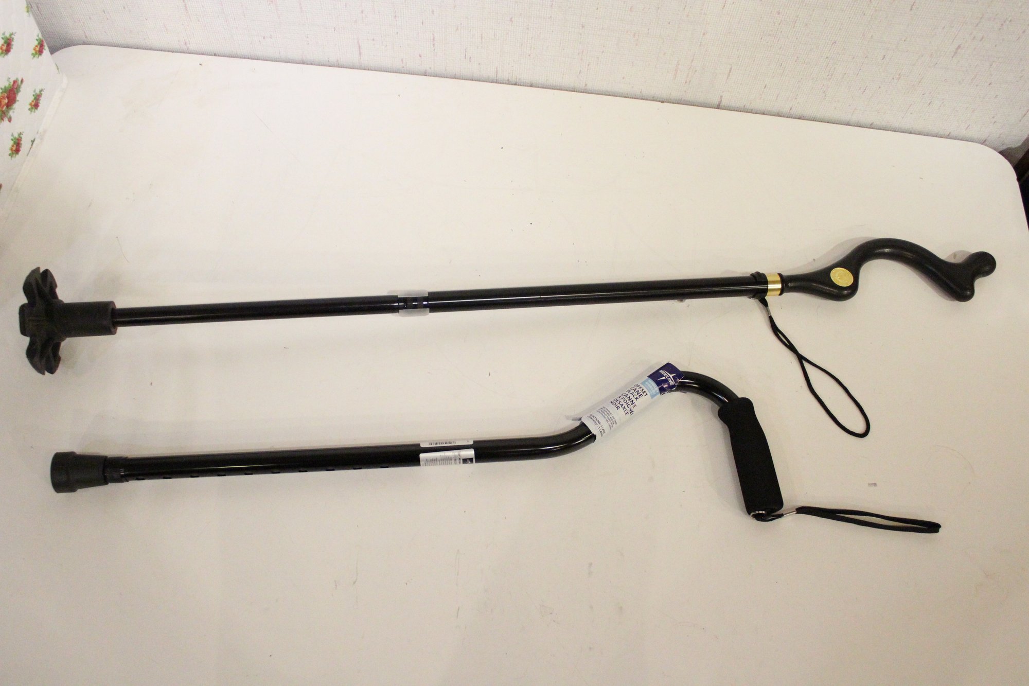 A Campbell Cane walking stick the original posture cane with rubber contoured end, and a black aluminum walking cane with comfortable offset foam handle & wrist strap, 300 lb capacity, push-button adjustable height (29”-38”) & locking ring. These items can be shipped.