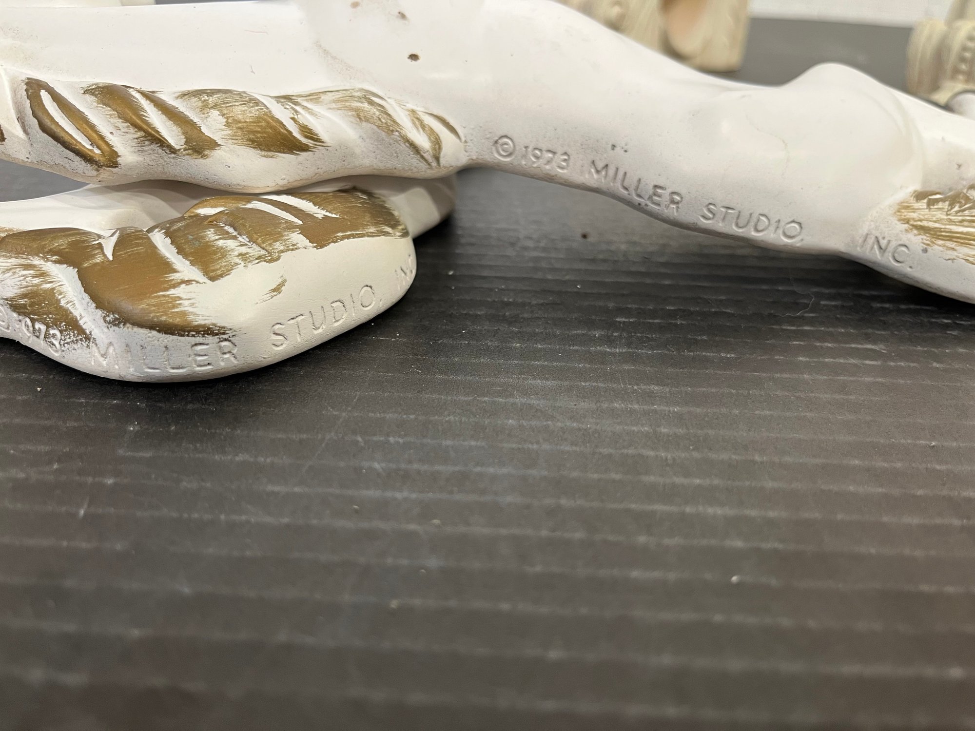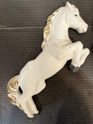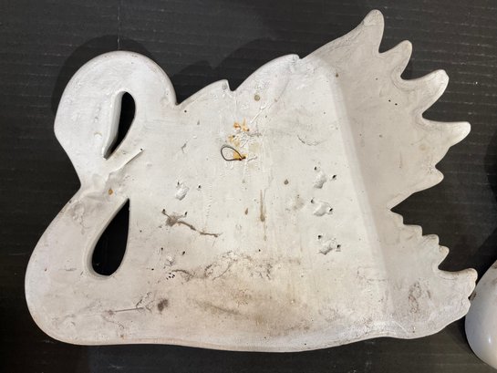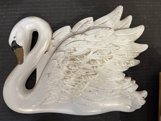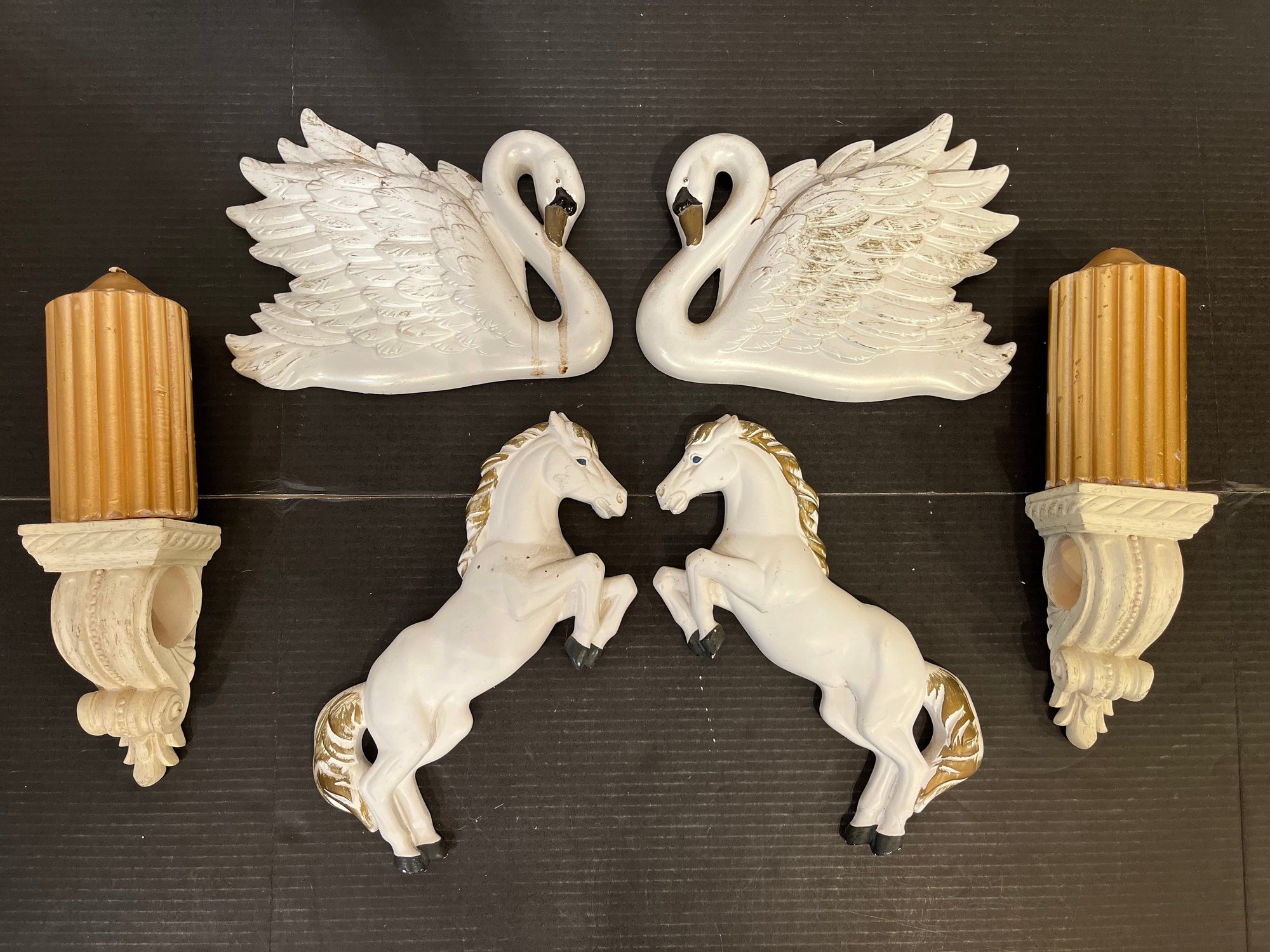 2 vintage 1968 Miller Studio chalkware swan wall plaques, 10" x 8". 2 vintage 1973 Miller Studio chalkware horse wall plaques, 12" x 5". A pair of ornate French style Franny curtain drapery scone, candle holder, 6" x 3" with 2 gold toned candles, 7". These items can be shipped.