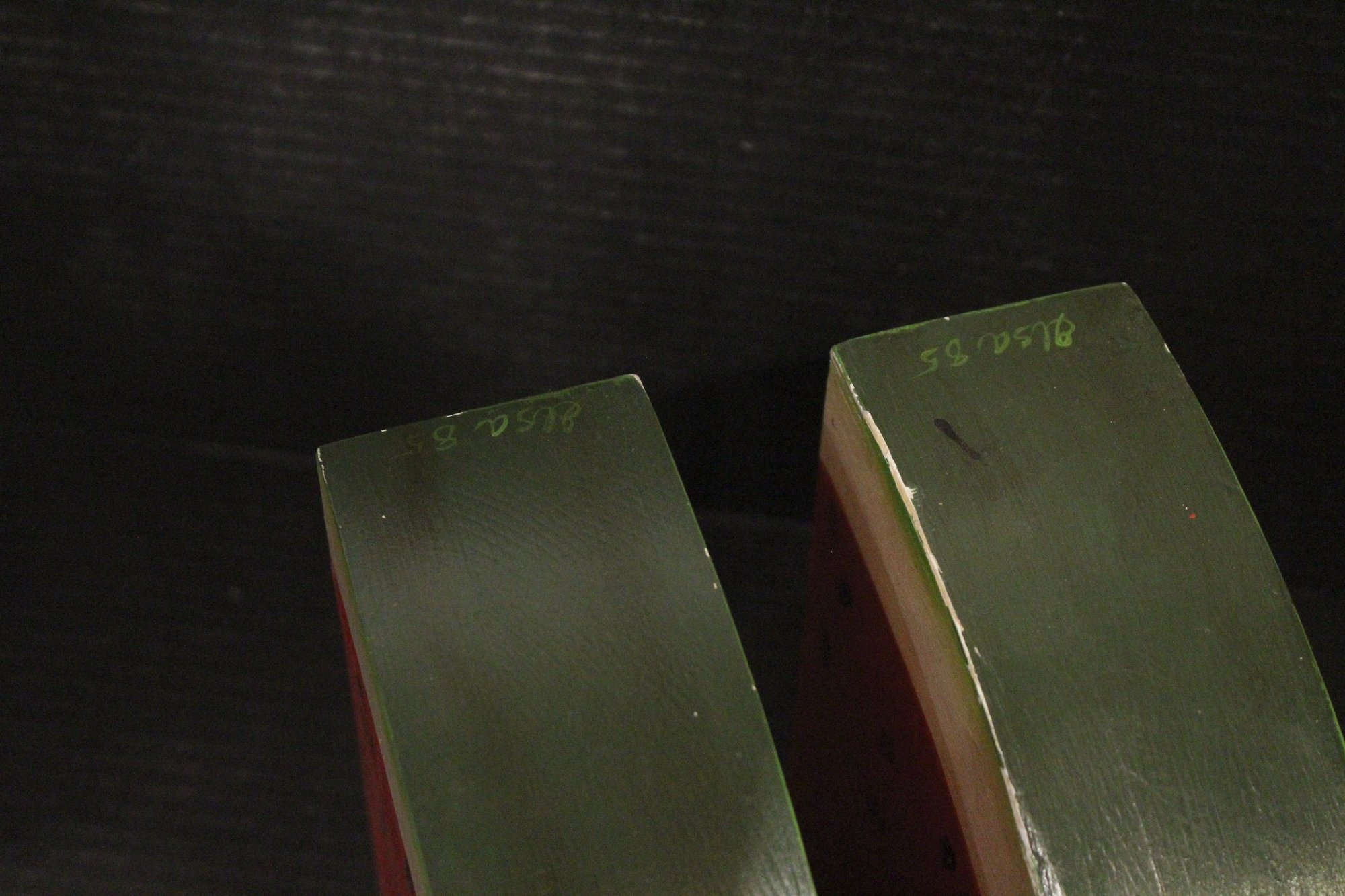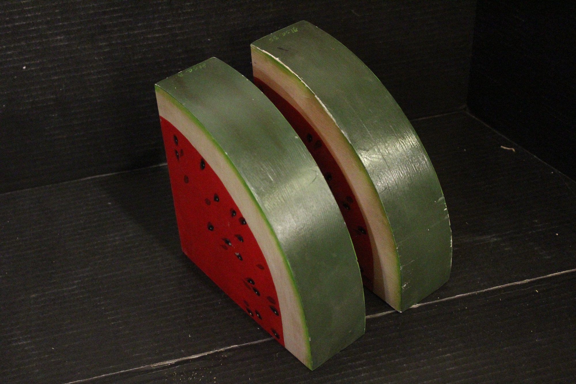 2 Vintage hand-painted wooden watermelon slices, 7" x 7" x 2.5"