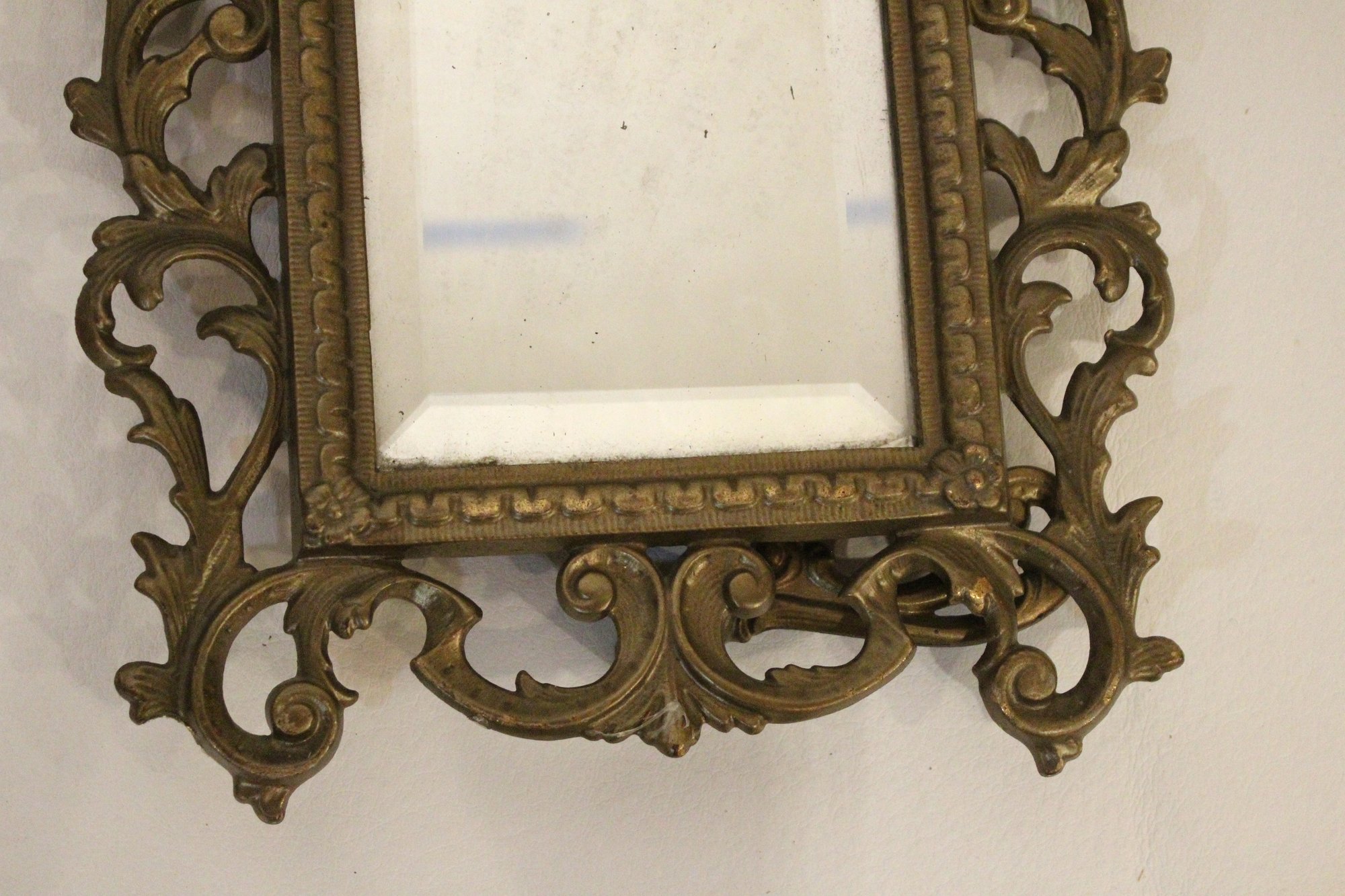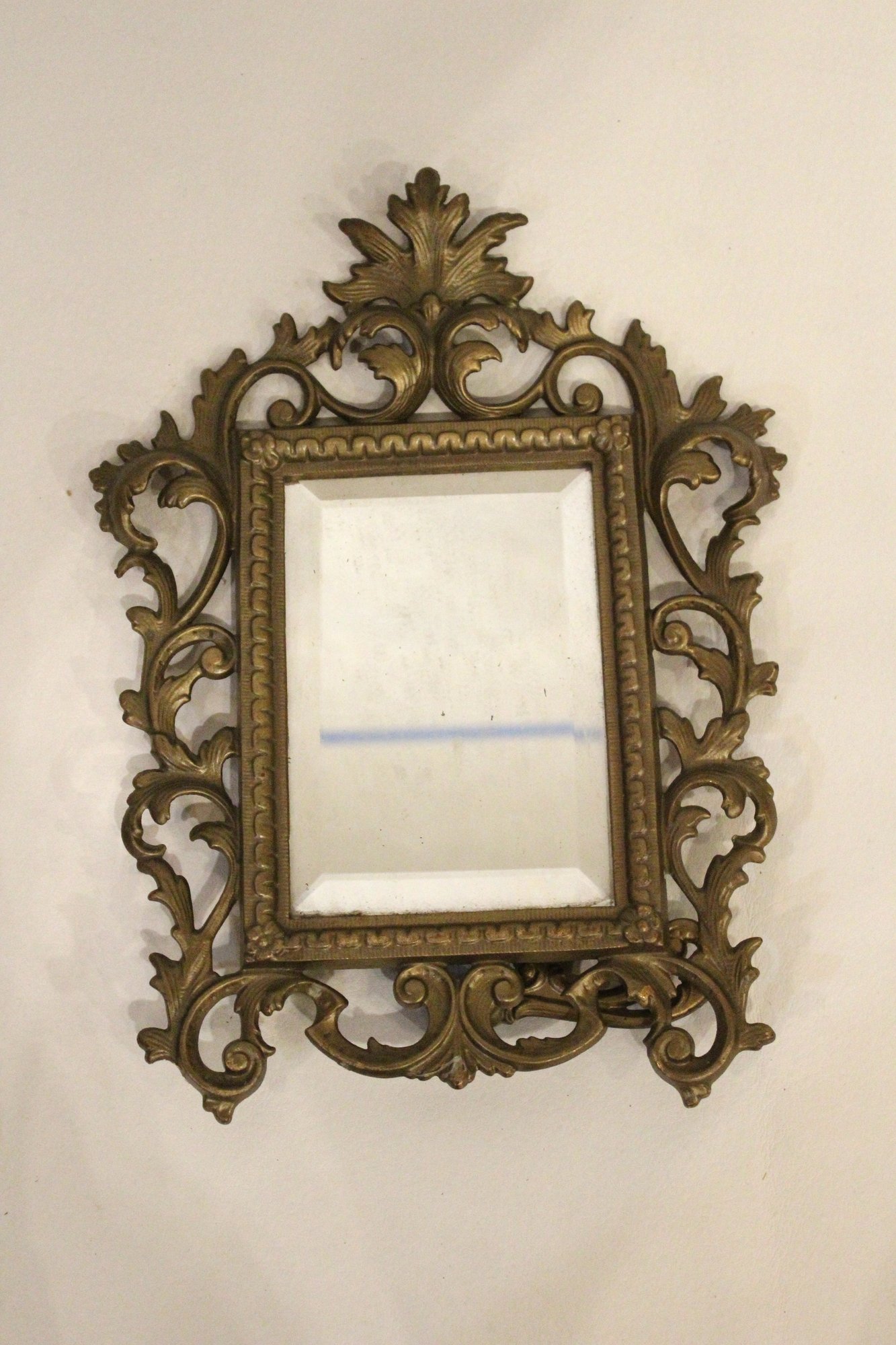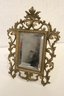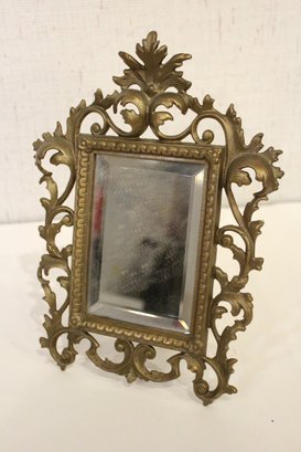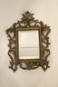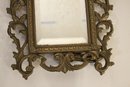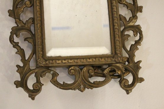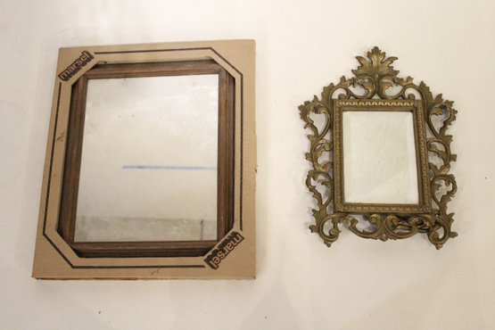 An ornate Rococo or Victorian style metal mirror at 12" x 9", and a Marsel retro wood MCM mirror at 11.5" x 9.5". These items can be shipped.