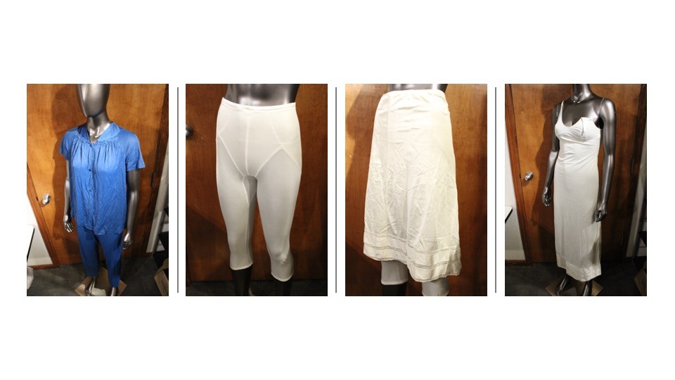 A blue Vanity Fair, size M, vintage pajama set, with a white Adonna vintage night set including size small leggings, size large skirt with lace, and a size small Adonna night dress with a damages shoulder strap as pictured. These items can be shipped.
