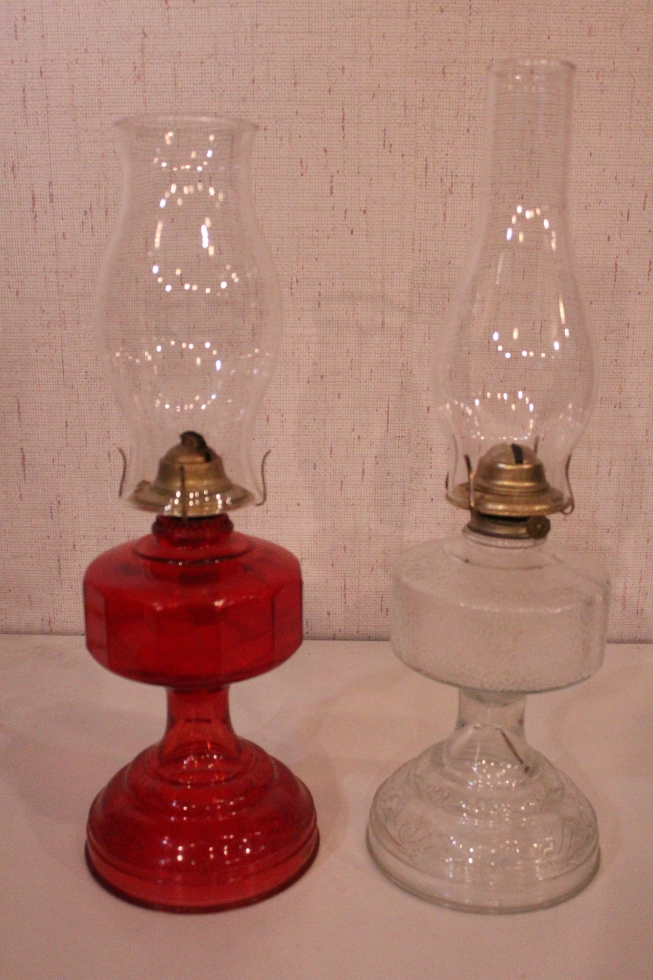 A set of 2 vintage oil lamps including a 70s vintage red glass oil lamp with a homesteader chimney lamp, and a second vintage textured clear glass oil lamp. These items can be shipped.