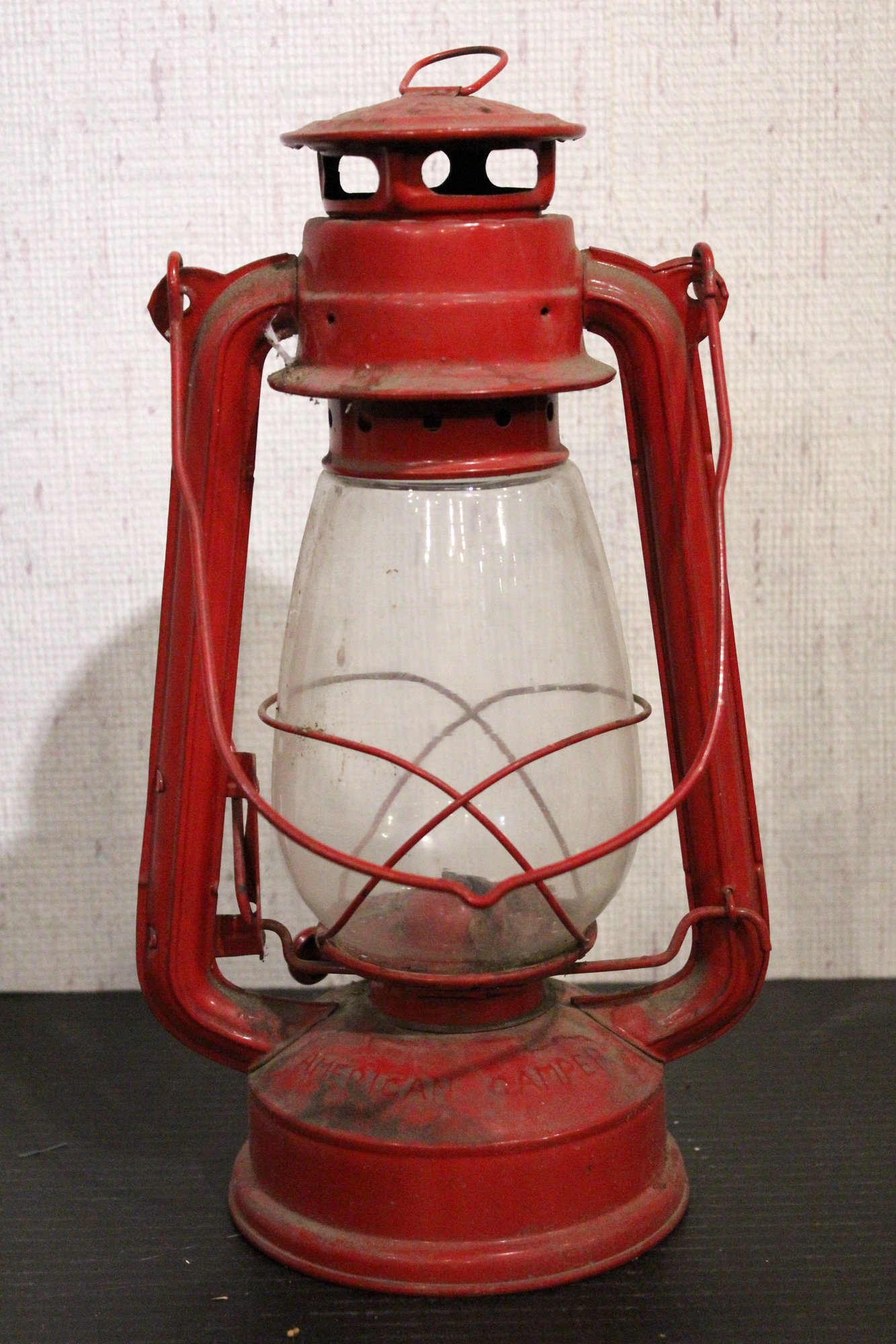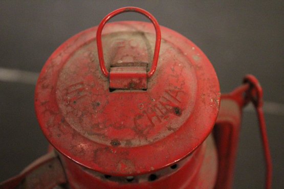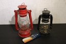 Vintage American Camper red oil lantern 12", and a vintage Original Dietz oil lamp 10", missing the glass. As well as a packet of 3/4" wick. These items can be shipped.