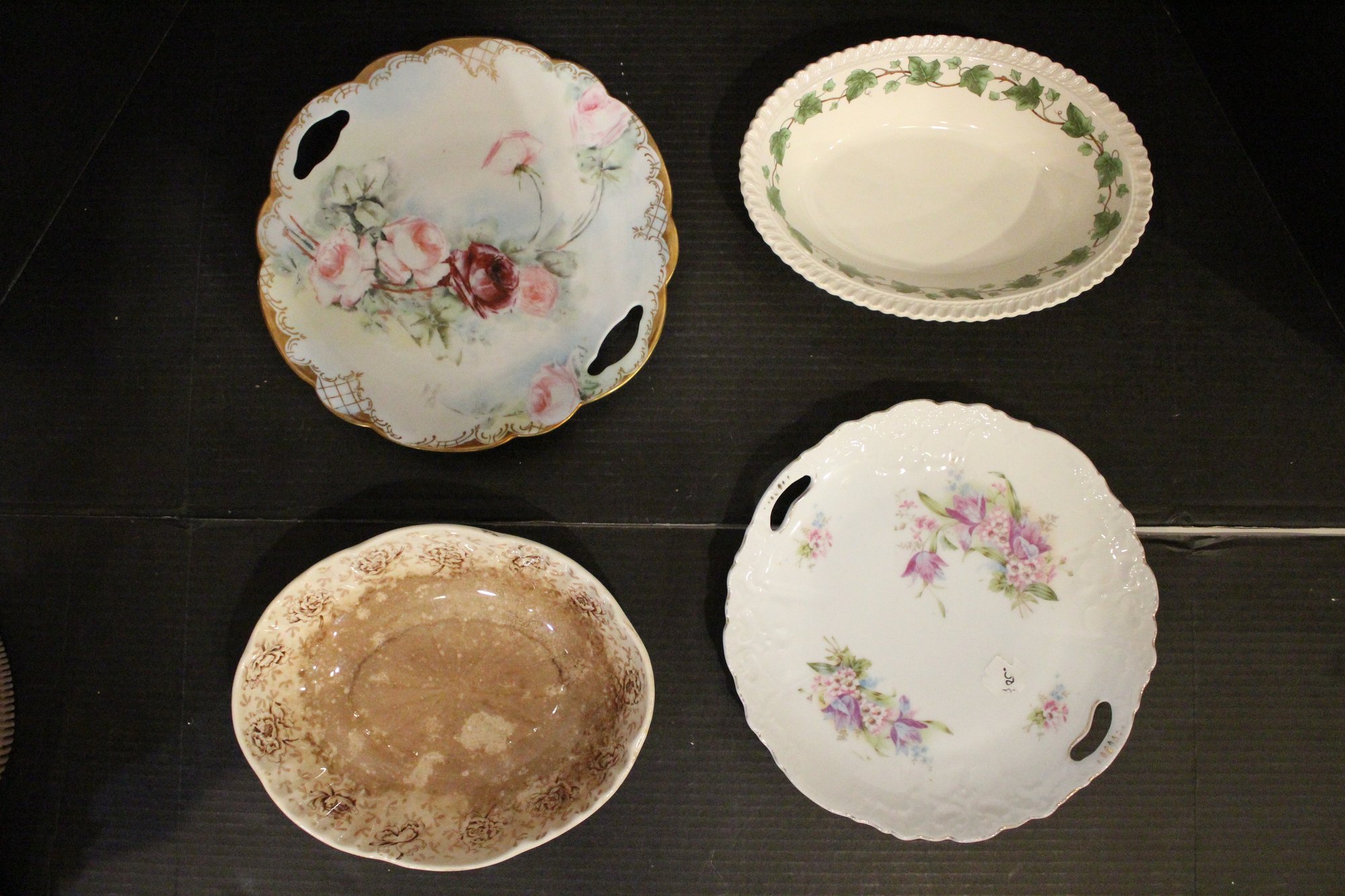 A vintage hand painted rose porcelain plate 10", vintage hand painted floral porcelain dessert plate, 10". A serving bowl, likely made of ironstone or semi-porcelain with rose brown transfer ware decoration, 9" x 7.5" x 2", with a vintage Harkerware Royal Gadroon Ivy serving bowl or rim soup bowl, 9.5" x 7" x 2". These items can be shipped.
