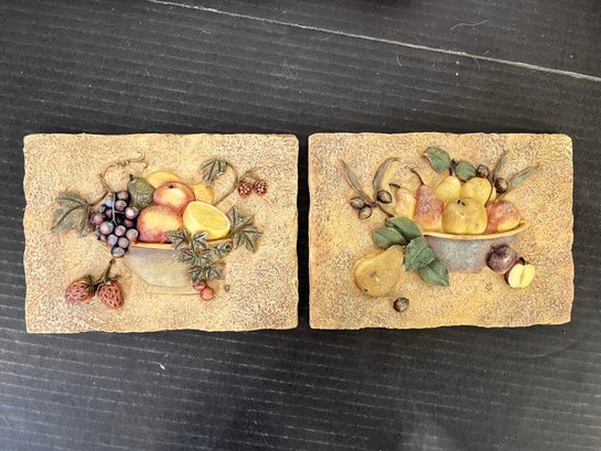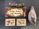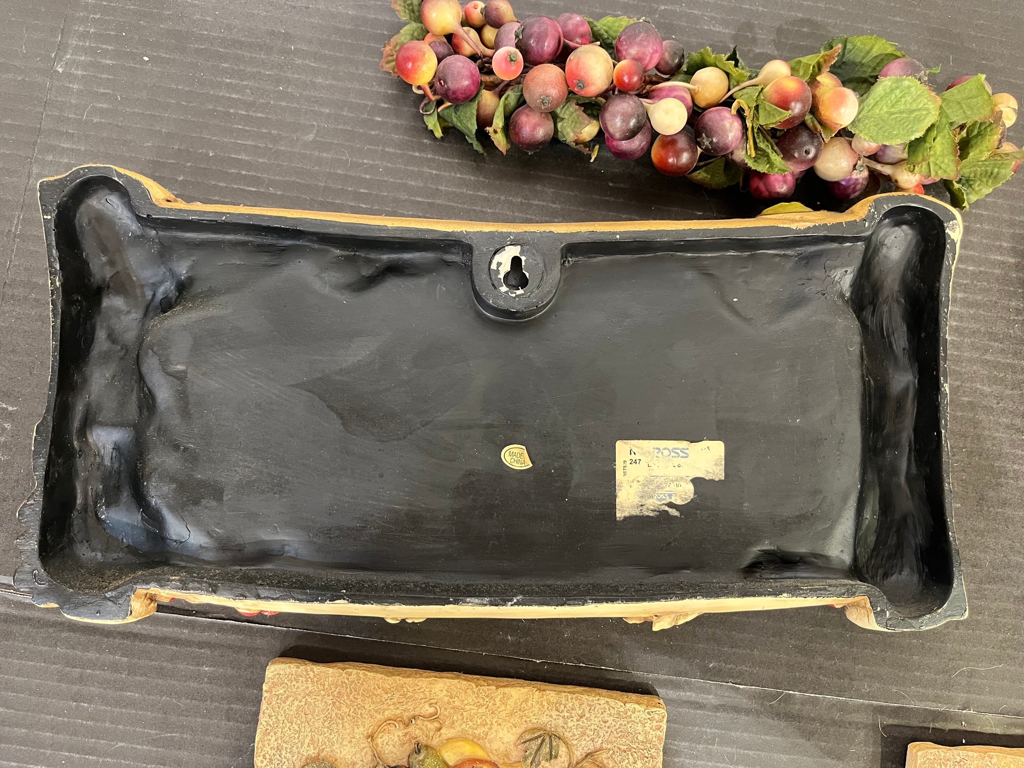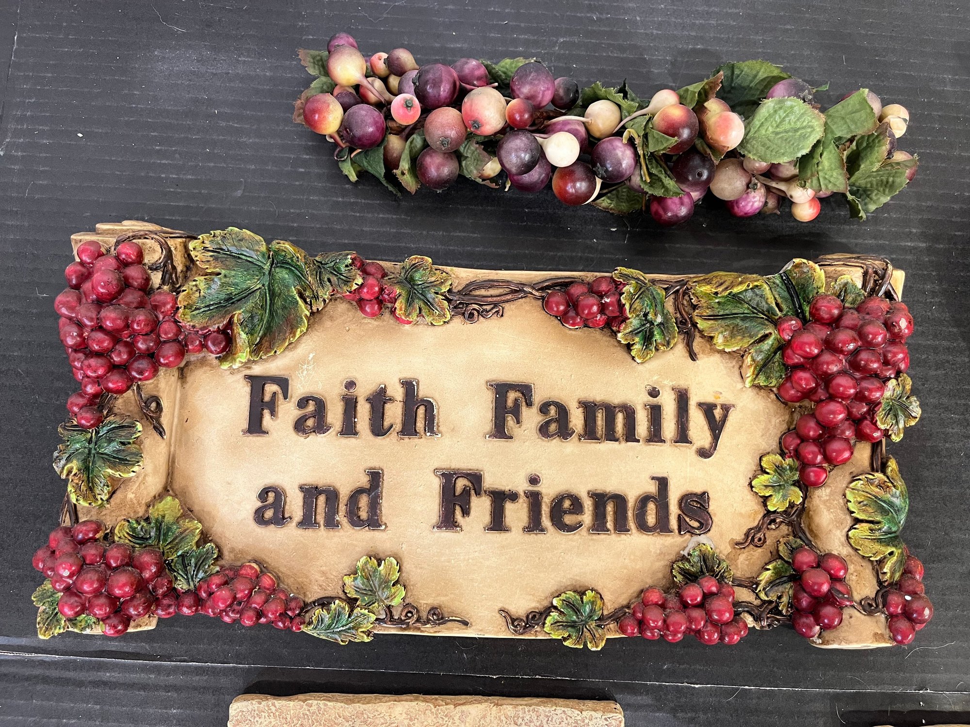 Faith Family and Friends sign, 14" x 7", and faux grapes on a vine, 11". 2 Vintage Cheri Blum Fruit Bowl Wall Plaques: 3D Kitchen Decor, 6.5" x 6", and a vintage wooden duck, 11" x 5" x 6", missing one eye and is well worn as pictured. These items can be shipped.