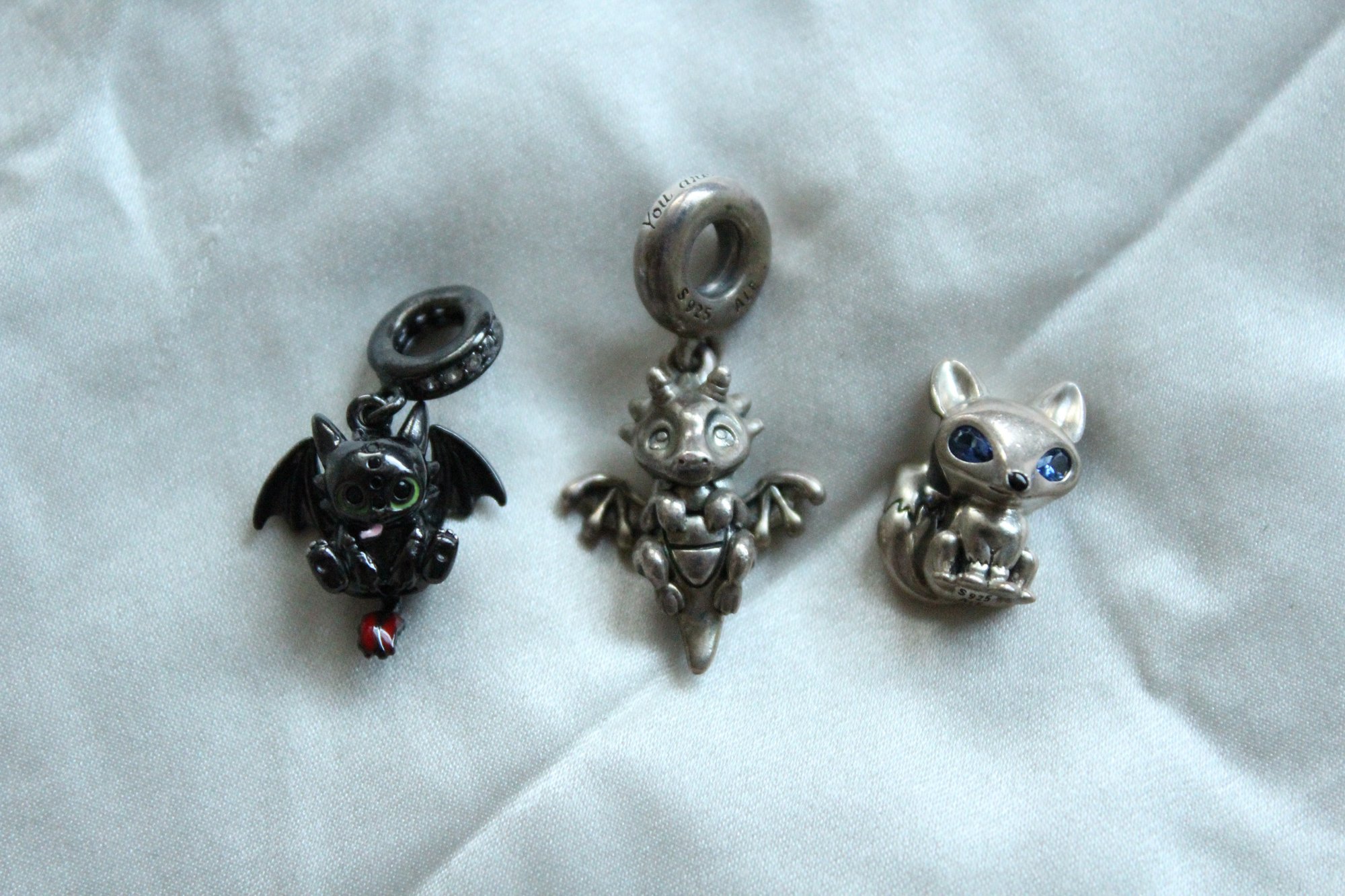 3 animal themed Pandora charms including; a non-Pandora brand 925 sterling silver Toothless Dragon charm fits Pandora bracelets. A Pandora "You Are Magic" Dragon Dangle Charm 925 ALE sterling silver. Lastly a Pandora Moments Blue-Eyed Fox Charm 925 ALE sterling silver, with blue pear-shaped crystal eyes and a black enamel nose. These items can be shipped.