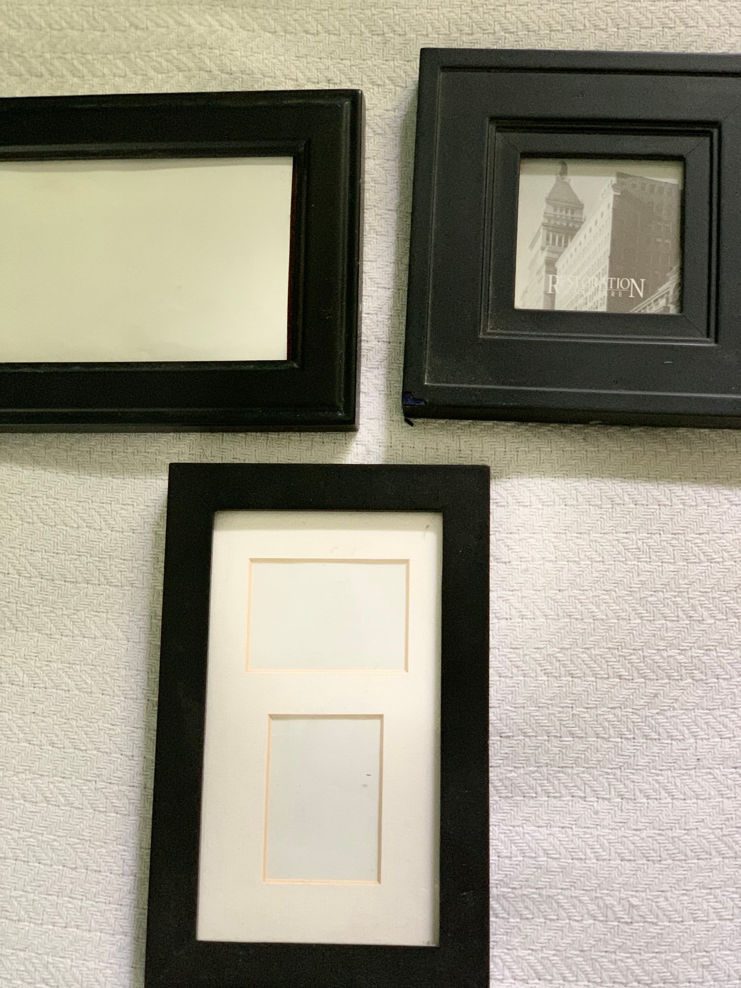 3 black wooden frames with glass. 1, 6x6”; 1, 6x8” with mat with 2 cut outs/dividers; 1, 5x8”. All gently used. No cracks or chips on glass. Square frame has small chip in corner (see pic).