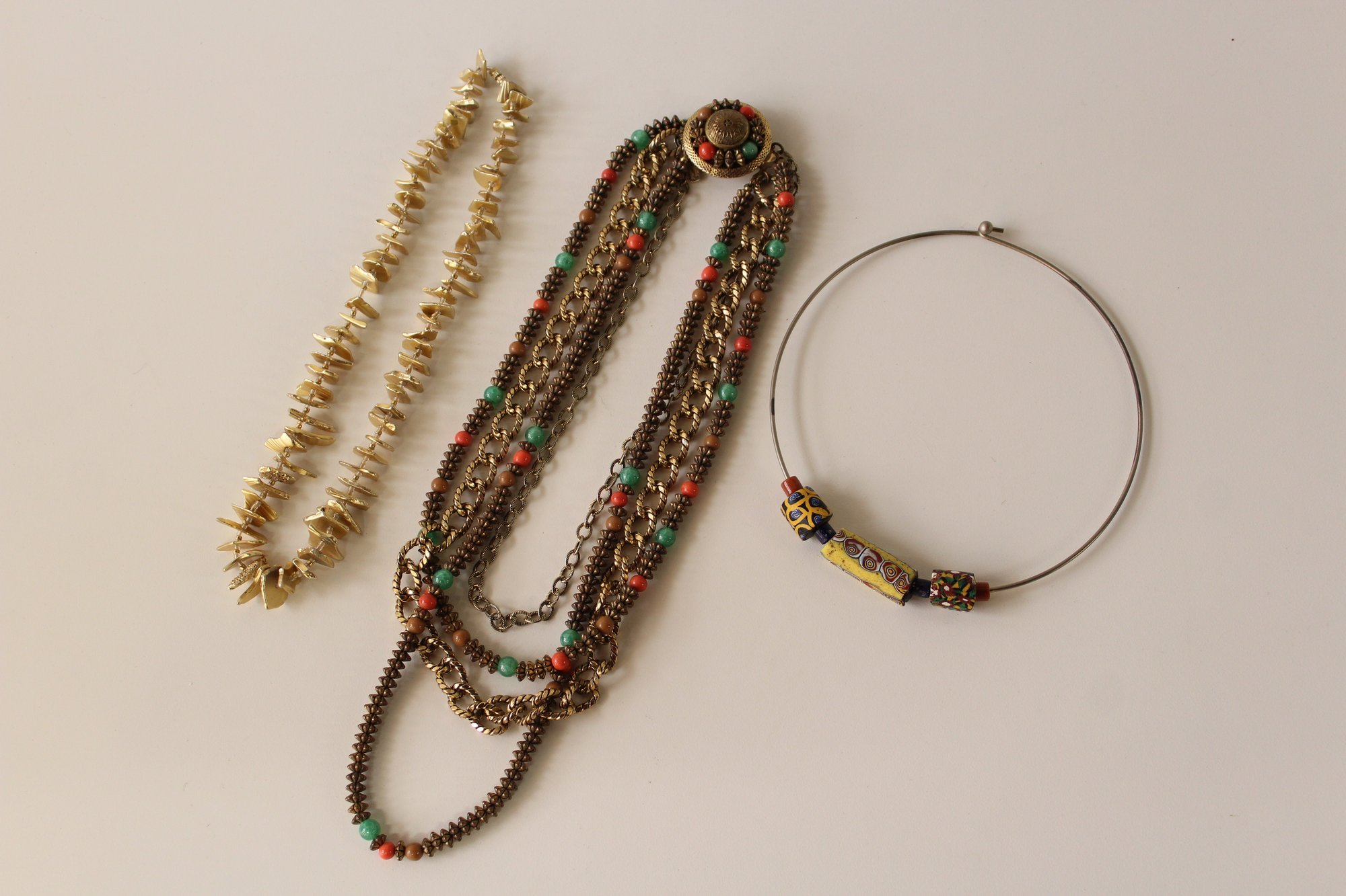 A gold-tone shell style necklace made of irregularly shaped flat plastic pieces, 17". A vintage 80s Hattie Carnegie necklace multiple chain colorful necklace, 18.5", and a collar necklace with colorful glass beads. These items can be shipped.