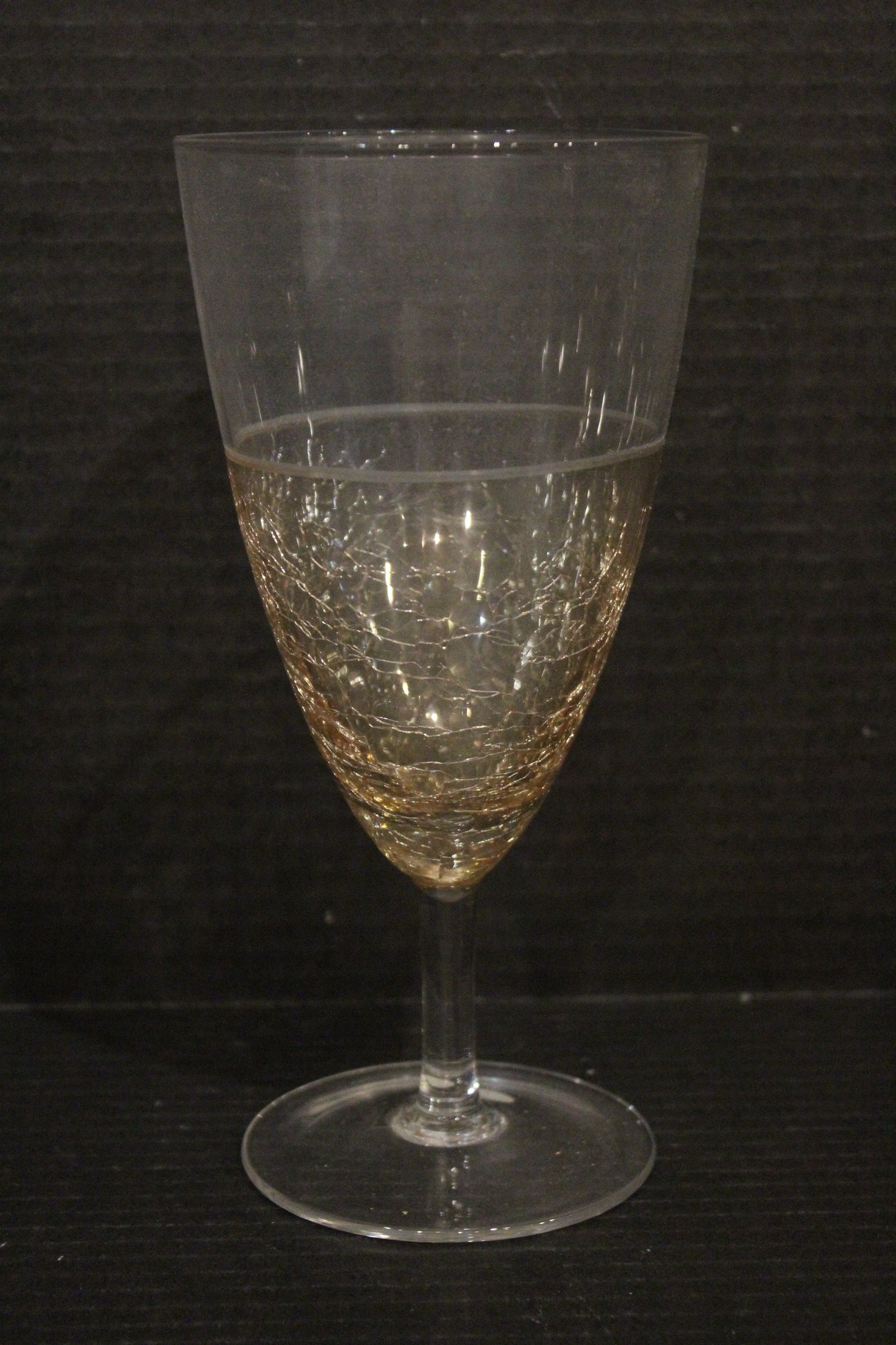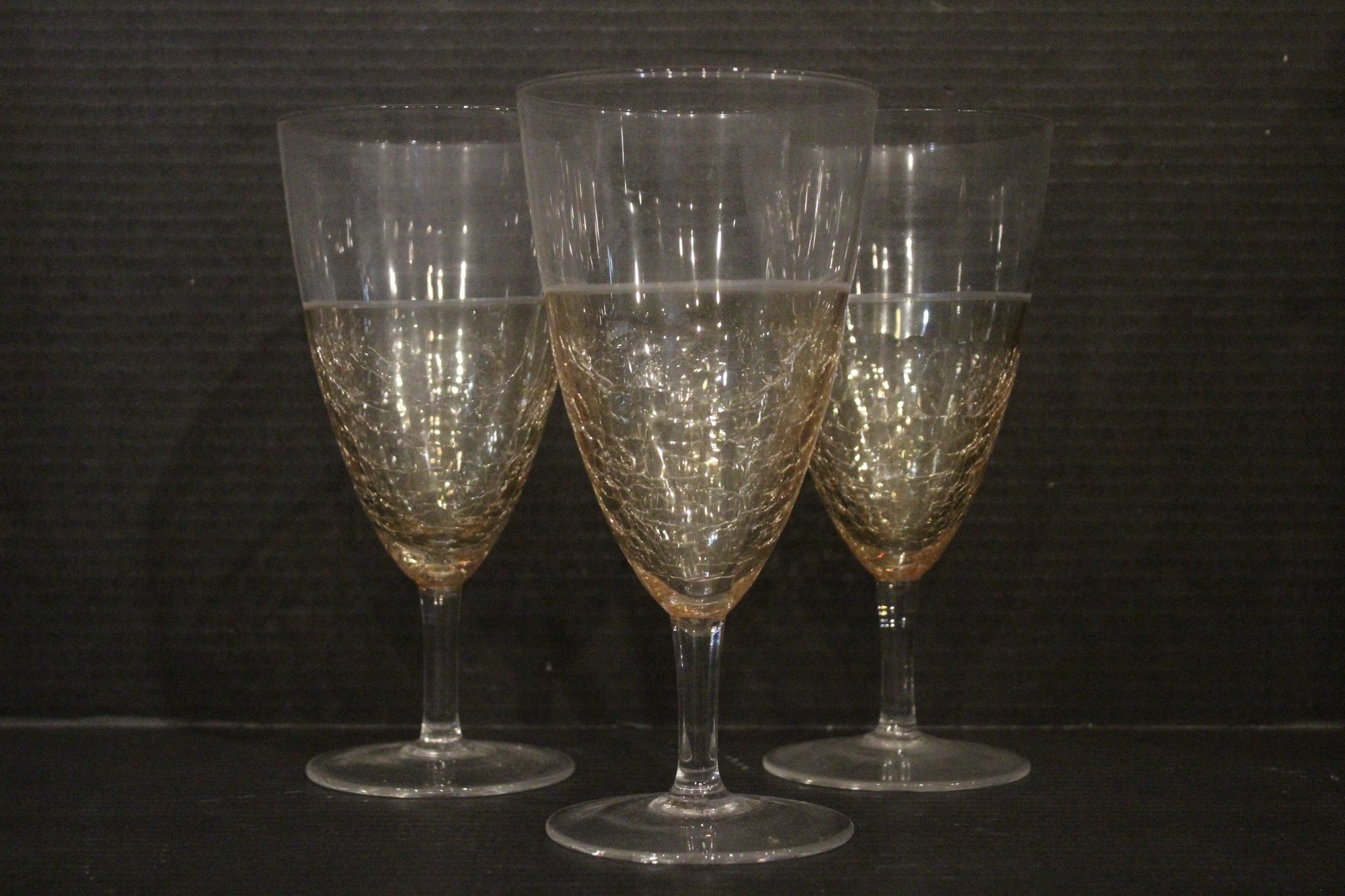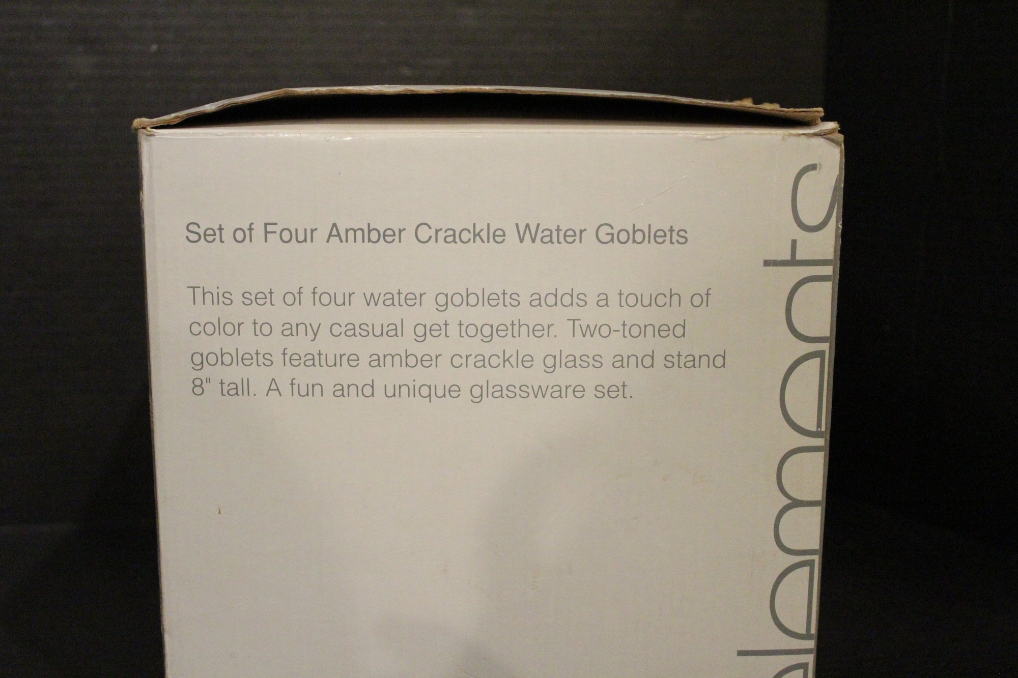3 Elements, Amber Crackle water goblets at 8" tall, plus and additional broken glass making 4 in total. These items can be shipped.