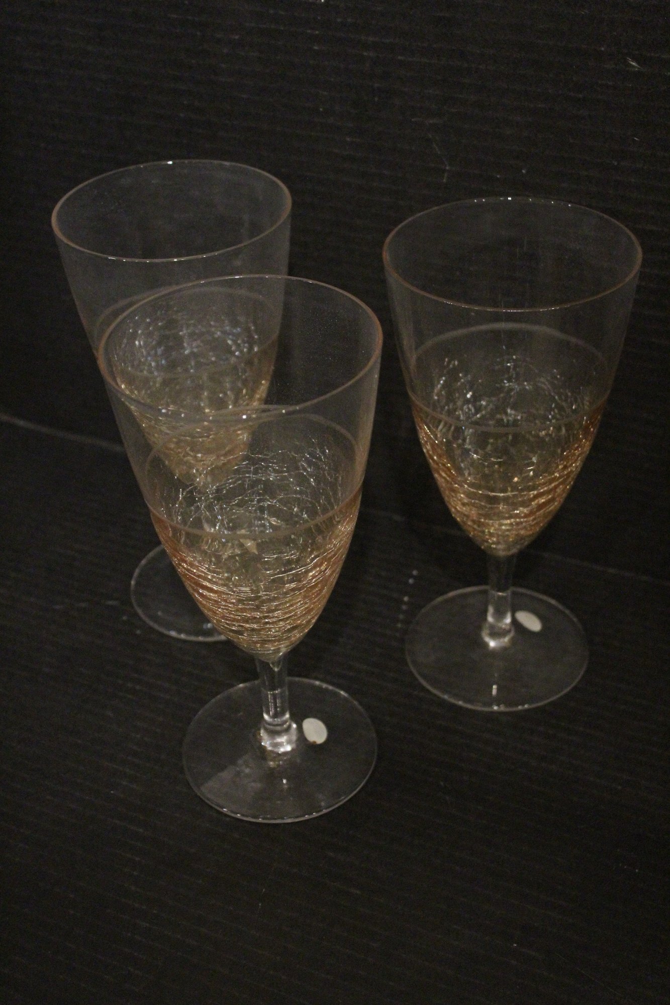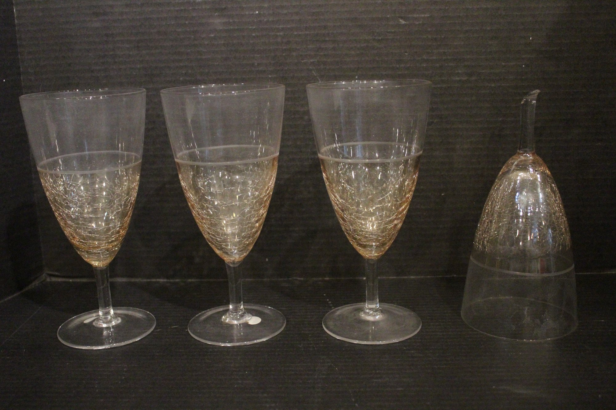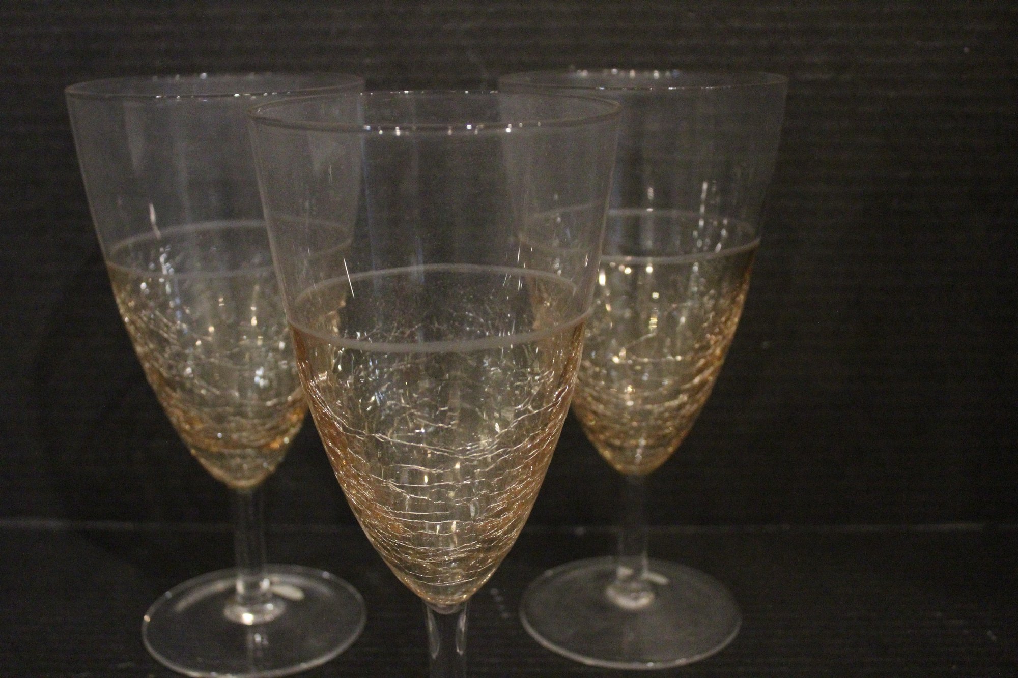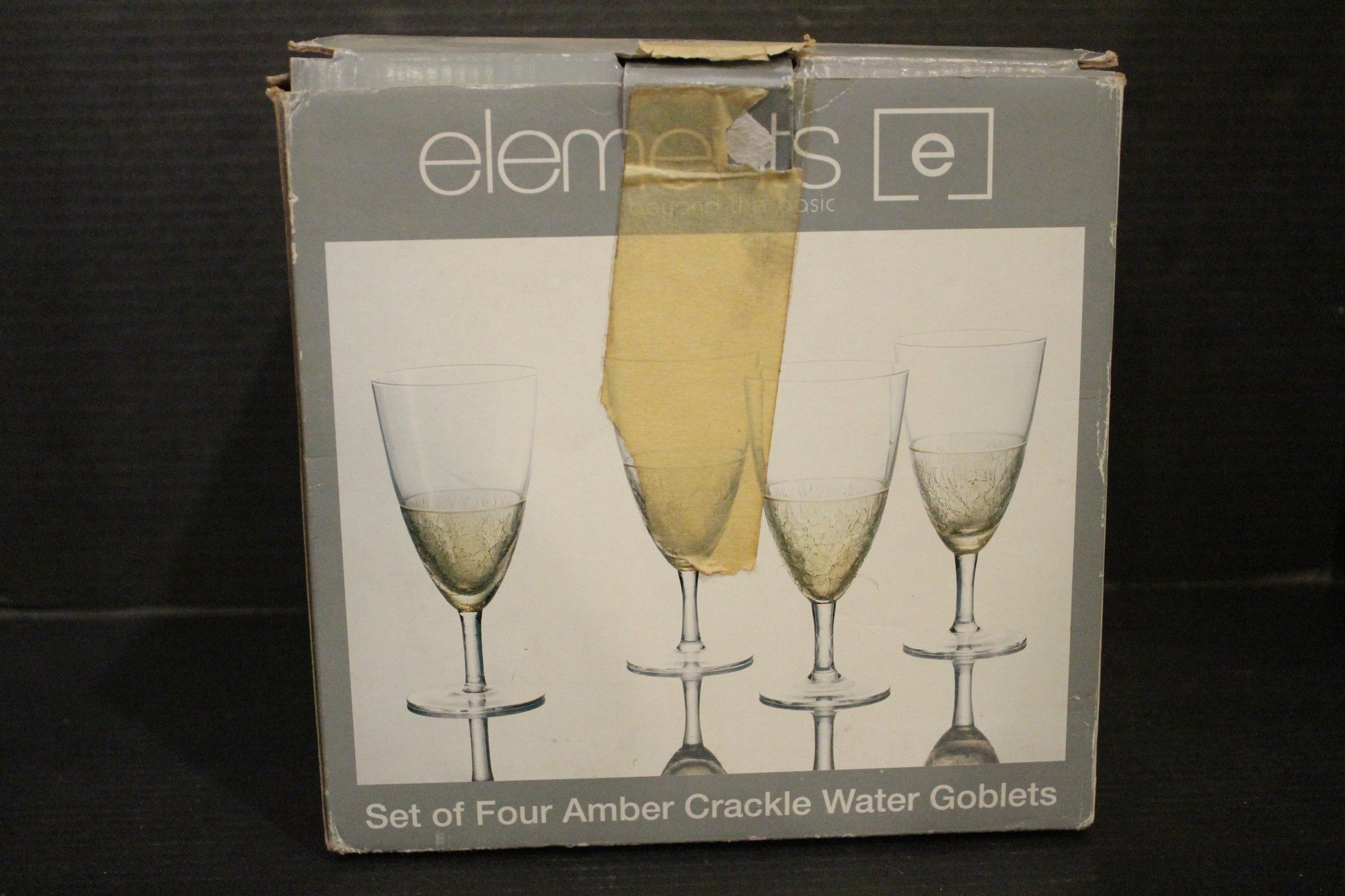 3 Elements, Amber Crackle water goblets at 8" tall, plus and additional broken glass making 4 in total. These items can be shipped.