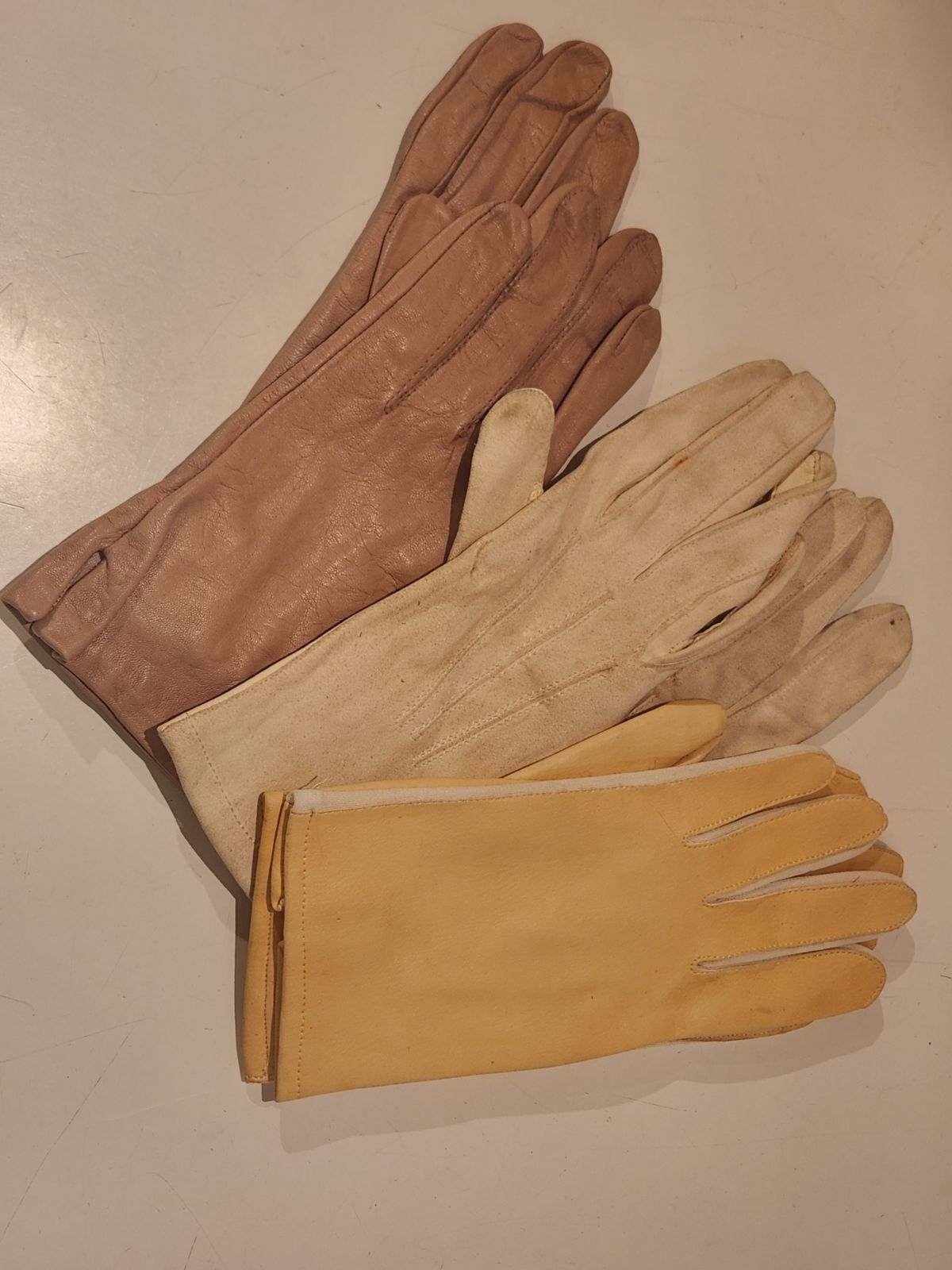 3 pairs of gloves in white, tan and light brown. Good condition
