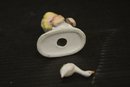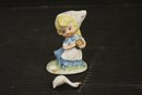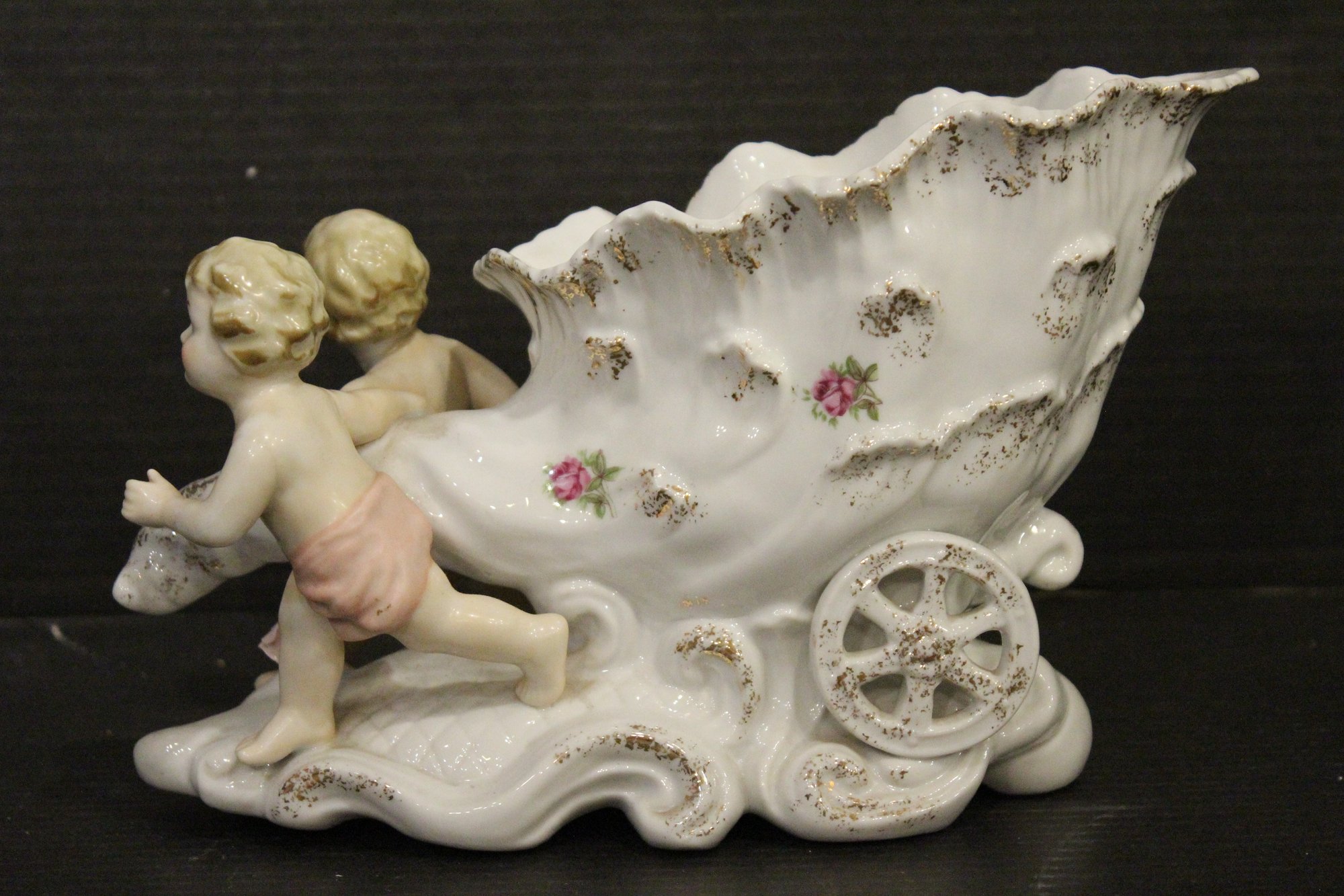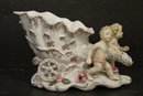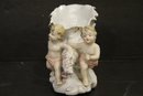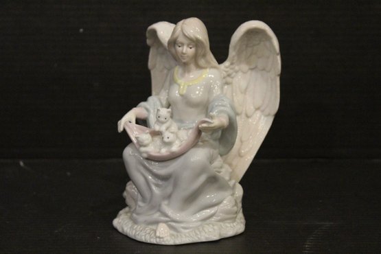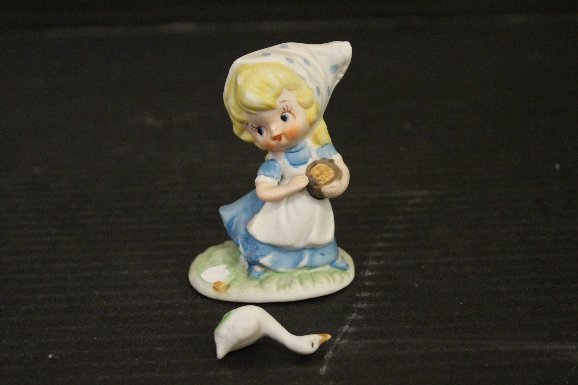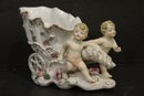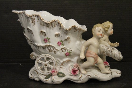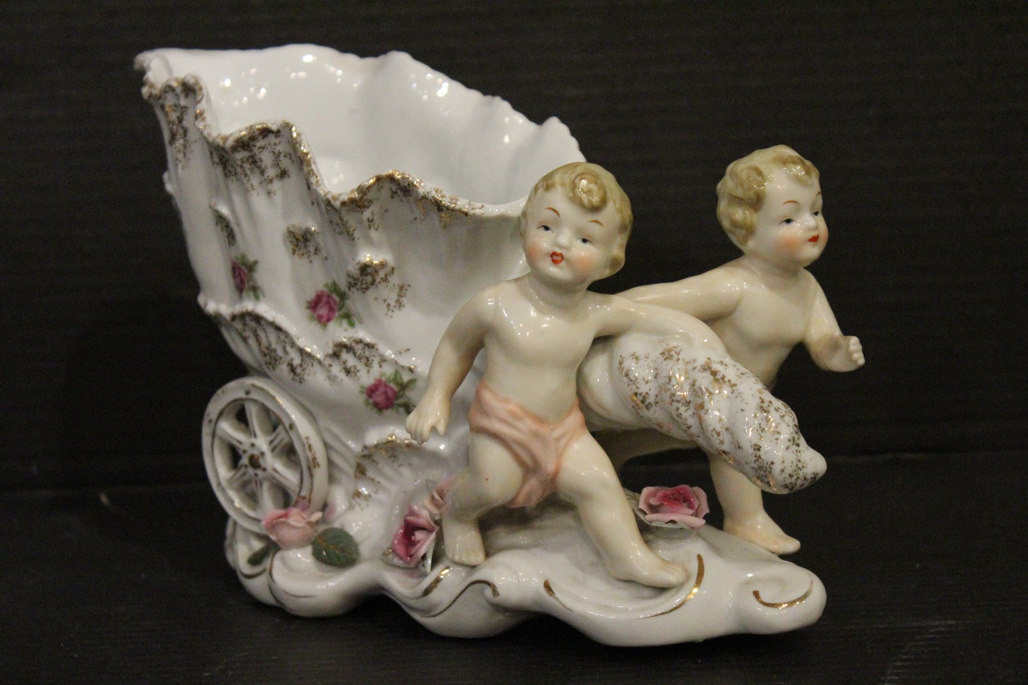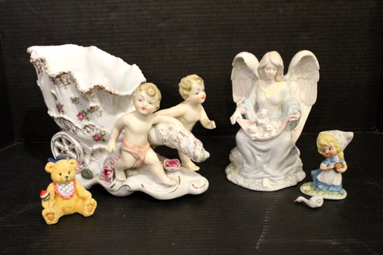 An ornate German white porcelain cornucopia shaped carriage/plater pulled by two putti, 11" x 7". A Cosmos angel figure holding 3 Cats, 7" x 5". A vintage 1996 BC Bronson Bear figurine, 3". Lastly a vintage Homco porcelain figurine of a girl feeding a goose, goose is broken off but intact as pictured, 3.5". These items can be shipped.